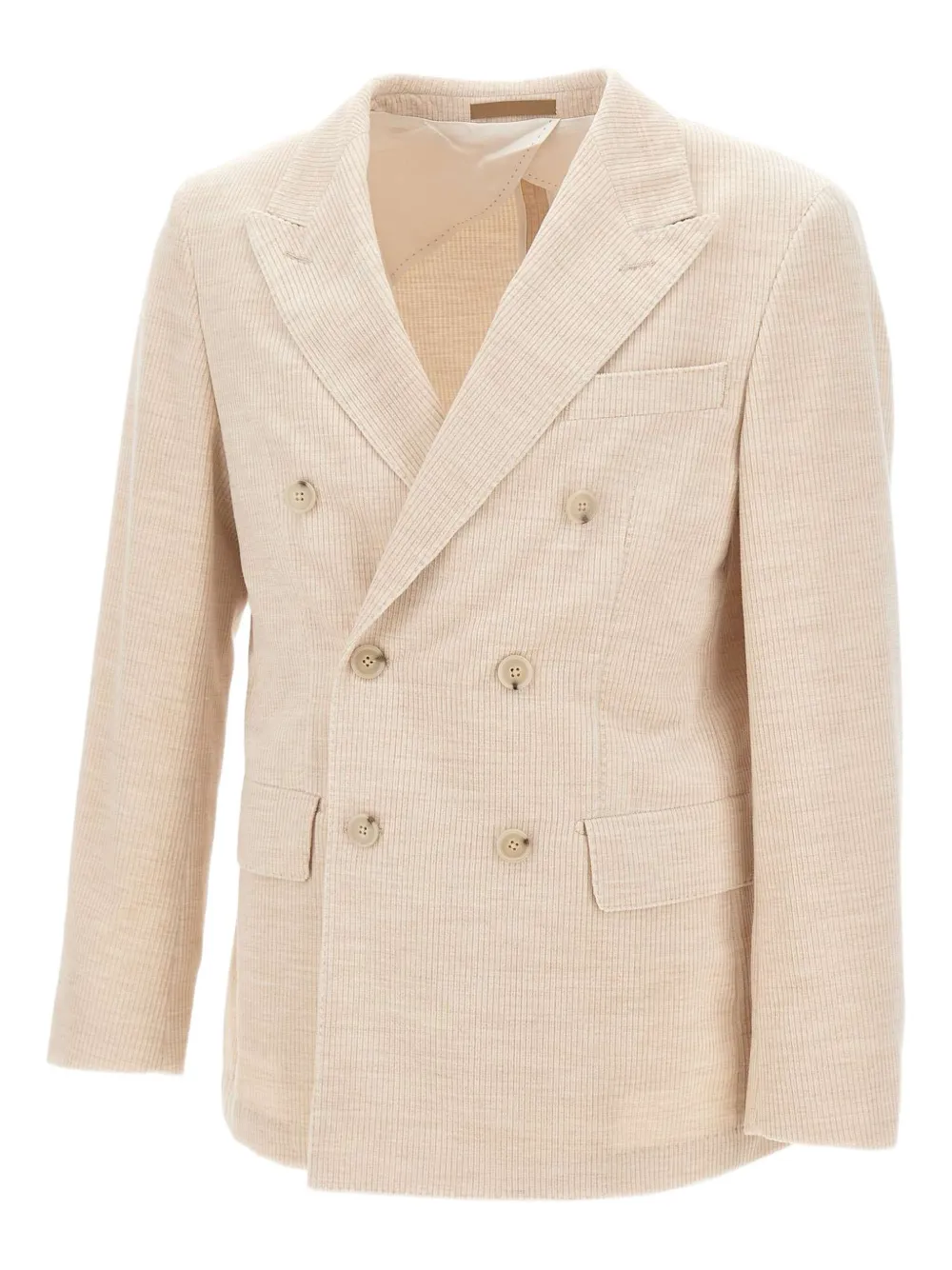 Бежевые пиджачные лацканы, двубортная застежка, фронтальные клапанные карманы, нагрудный карман, две задние шлицы
