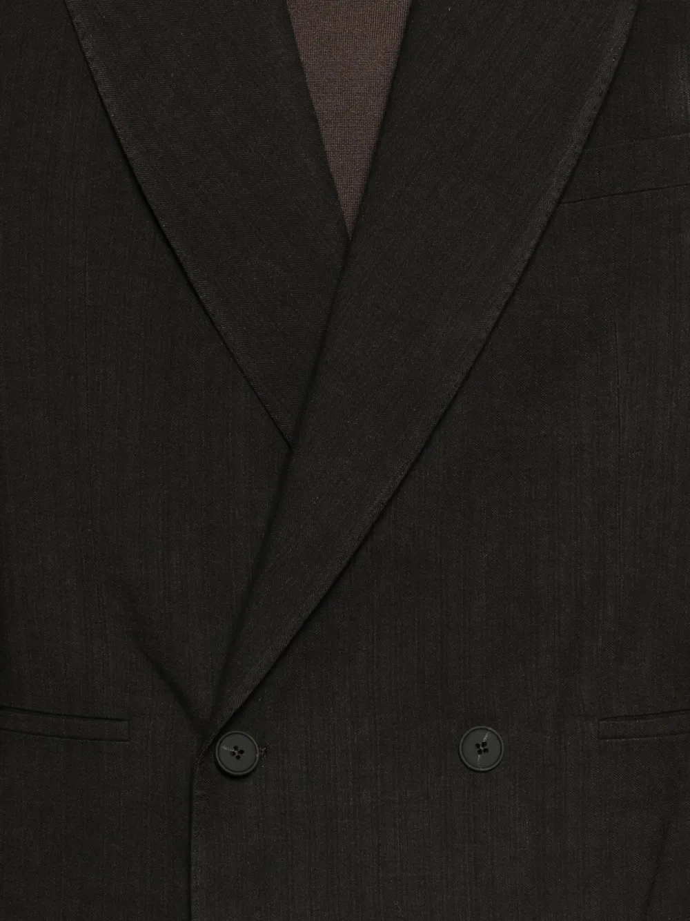 Черный двубортный пиджак с заостренными лацканами, застежкой на пуговицы и длинными рукавами