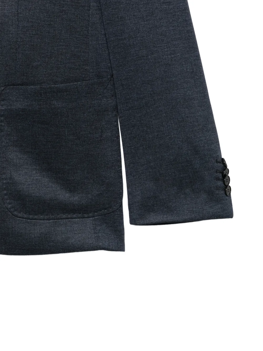 Темно-синяя куртка с капюшоном, передними карманами, застежкой на пуговицы, длинными рукавами и манжетами на пуговицах