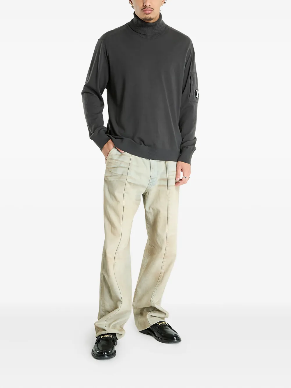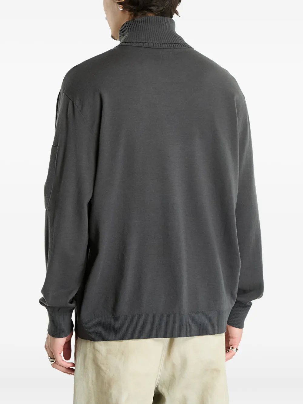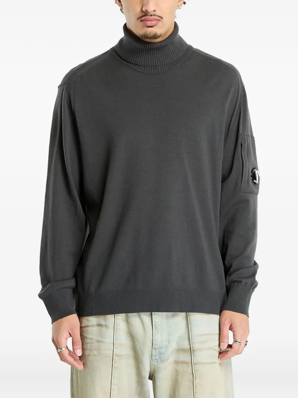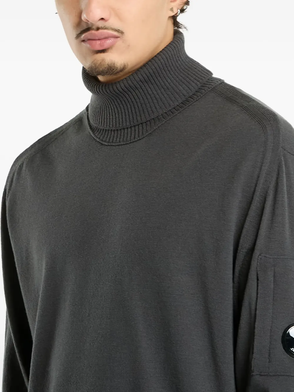 Серый свитер с воротником-гольф и длинными рукавами, деталью-«линзой» от C.P. Company. Рекомендуется снимать все съемные аксессуары перед стиркой.