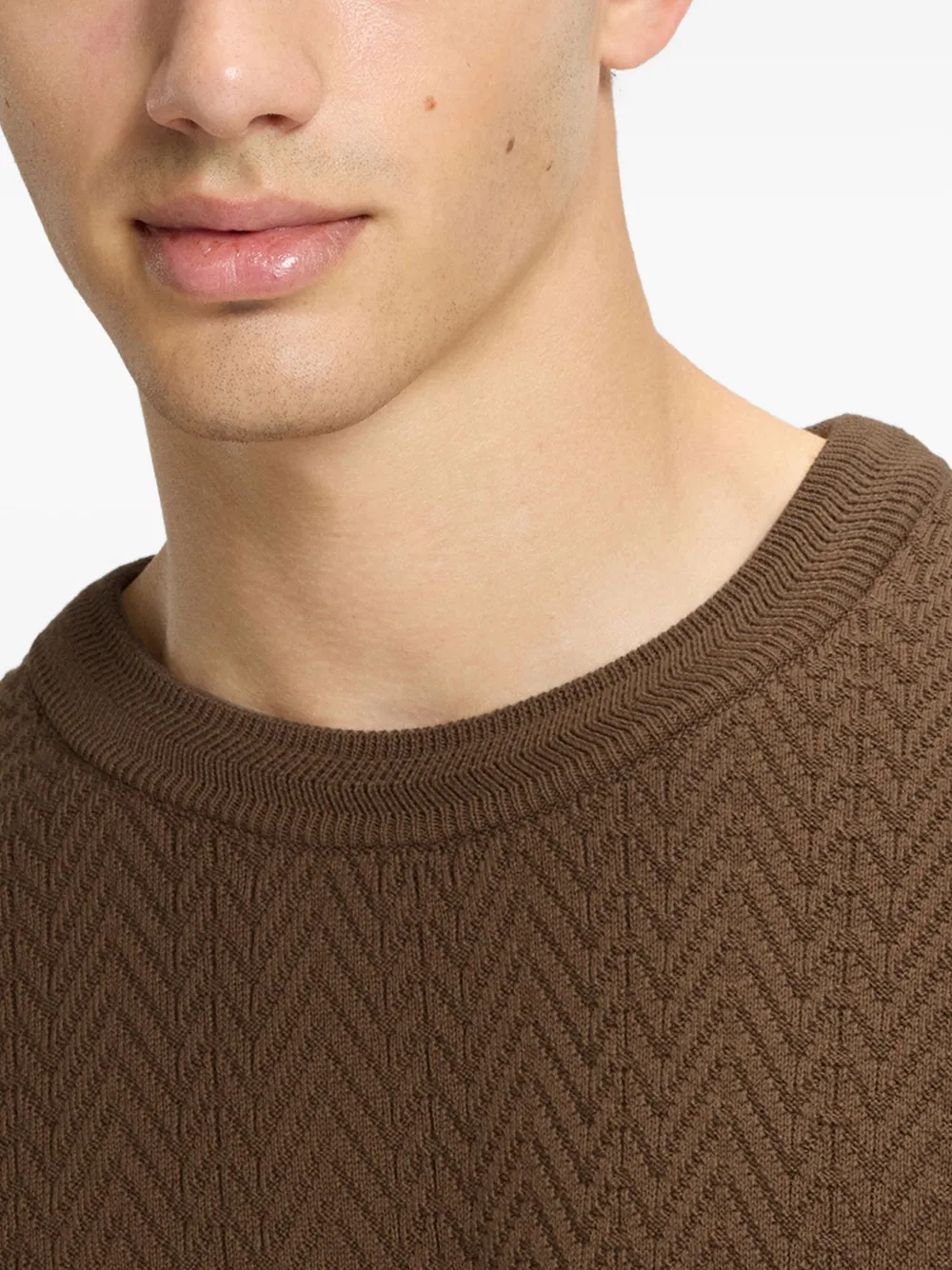 Коричневый трикотаж с текстурой, круглый вырез, длинные рукава, манжеты и низ в рубчик