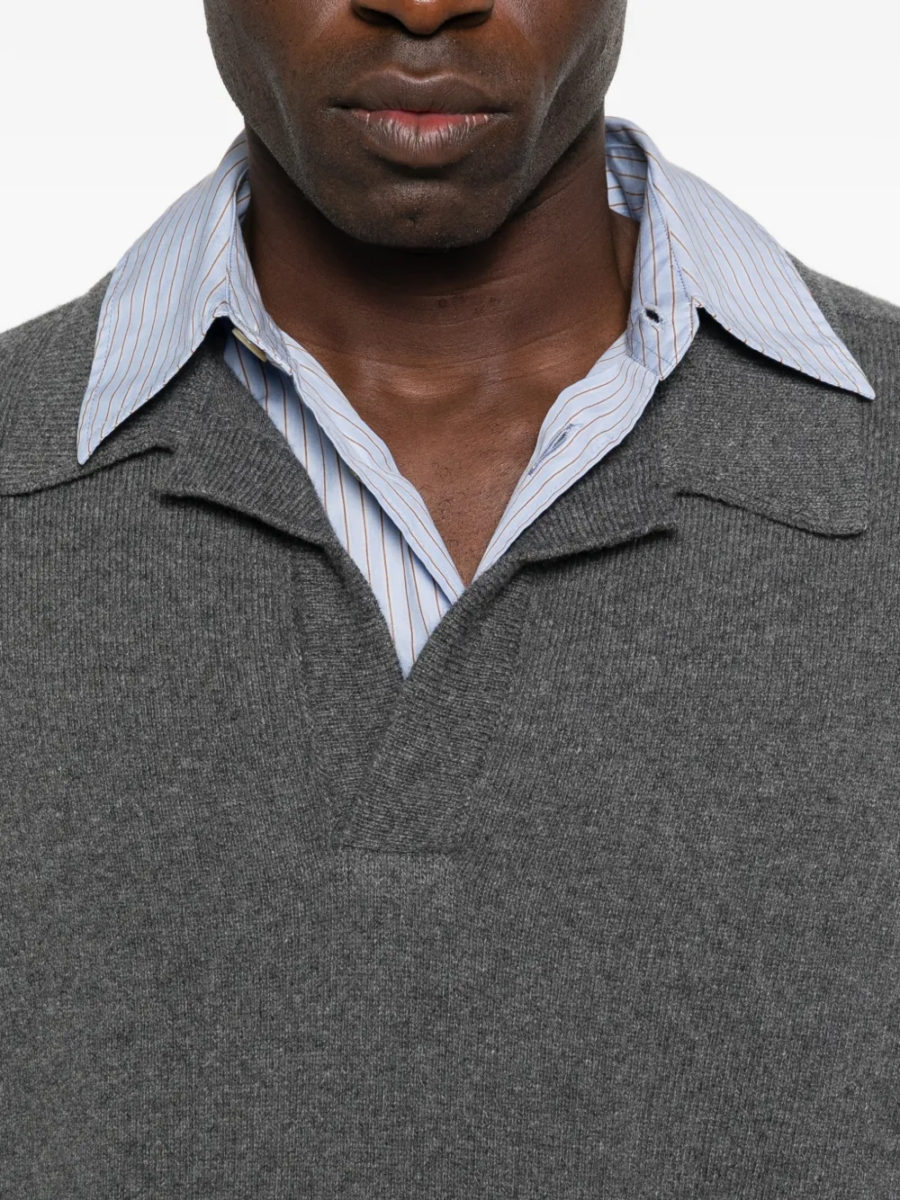 Серый лонгслив с длинными рукавами, воротником поло и V-образным вырезом