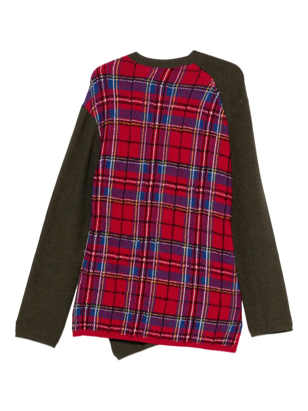 Оливково-зеленая шерсть, детали с клетчатым узором, круглый вырез, асимметричный подол