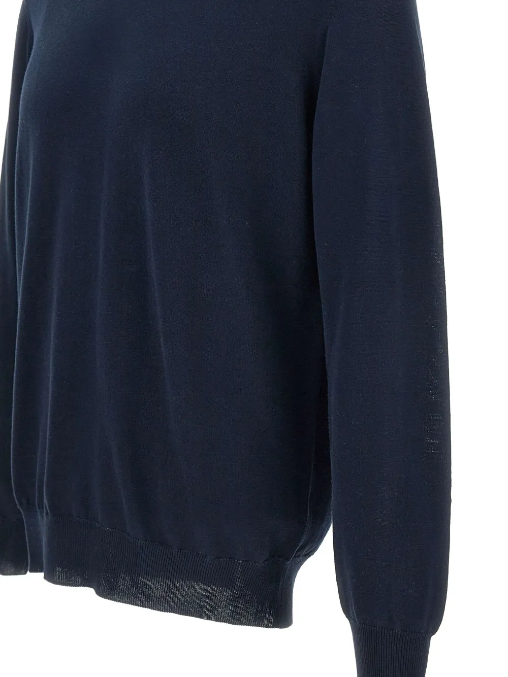 Темно-синего цвета, с длинными рукавами, круглым вырезом и ребристыми манжетами