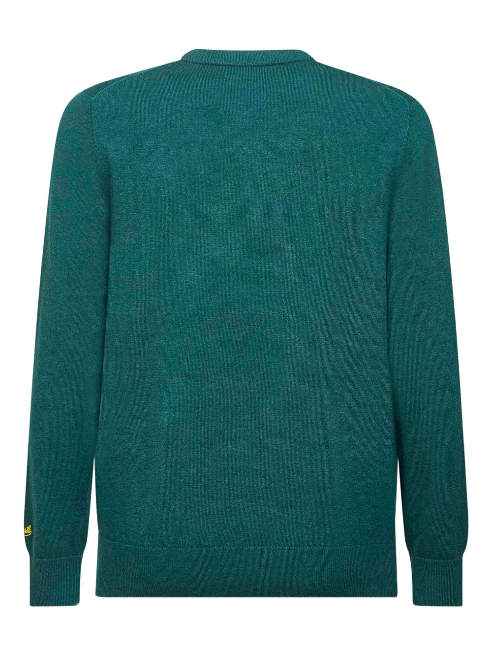 Зеленая вышивка с надписью на груди, гладкая вязка, вязаный воротник-резинка, длинные рукава, манжеты-резинка, нижний край-резинка