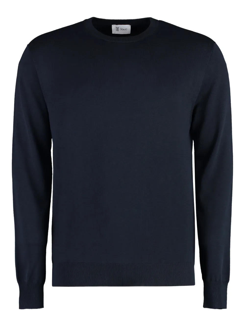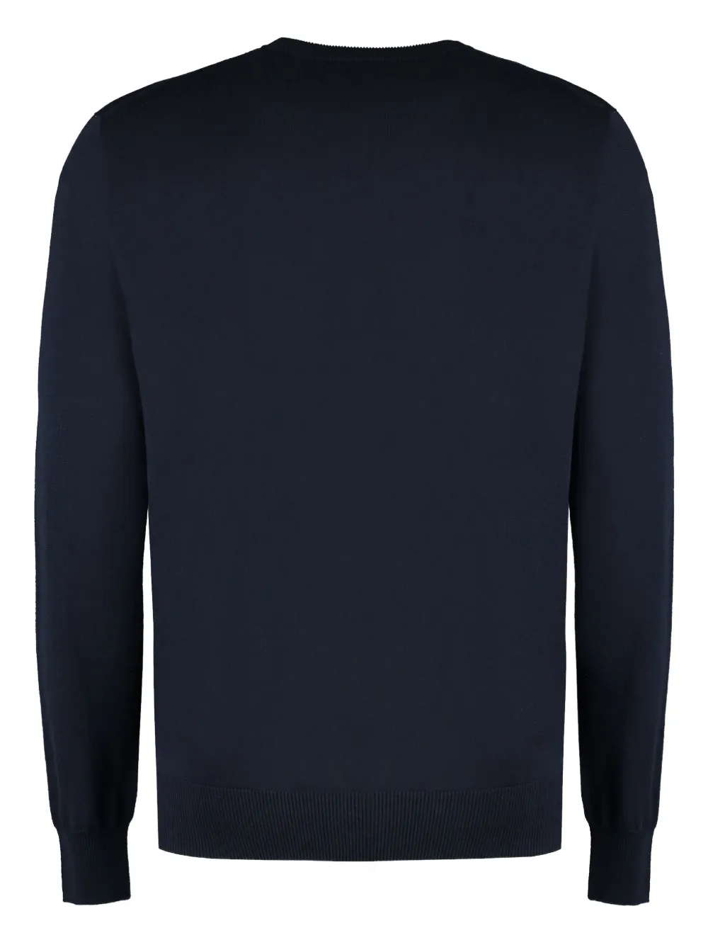 Темно-синий пуловер из смеси хлопка и шелка с ребристыми краями, круглым вырезом, длинными рукавами и прямым подолом