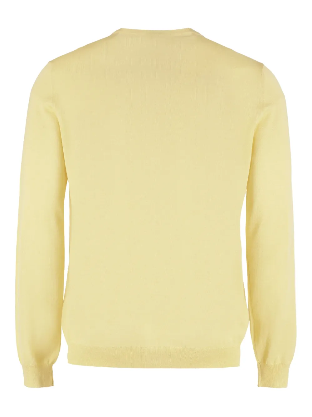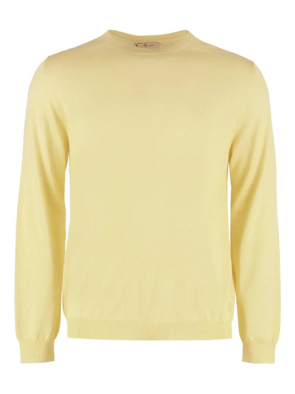 Бледно-желтый пуловер из смеси кашемира и шелка с ребристыми краями, круглым вырезом, длинными рукавами и прямым подолом