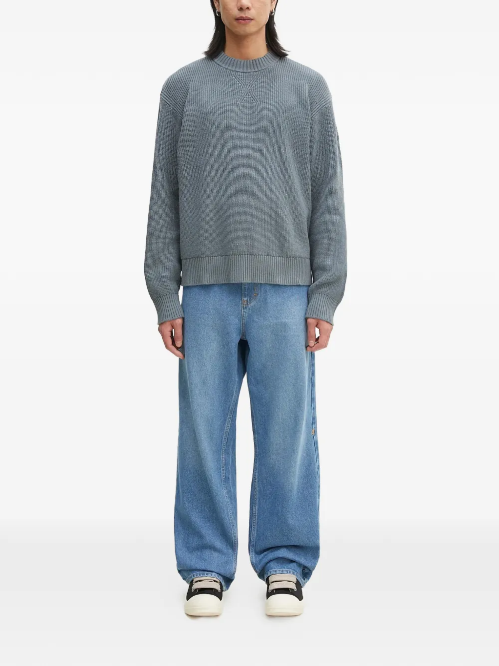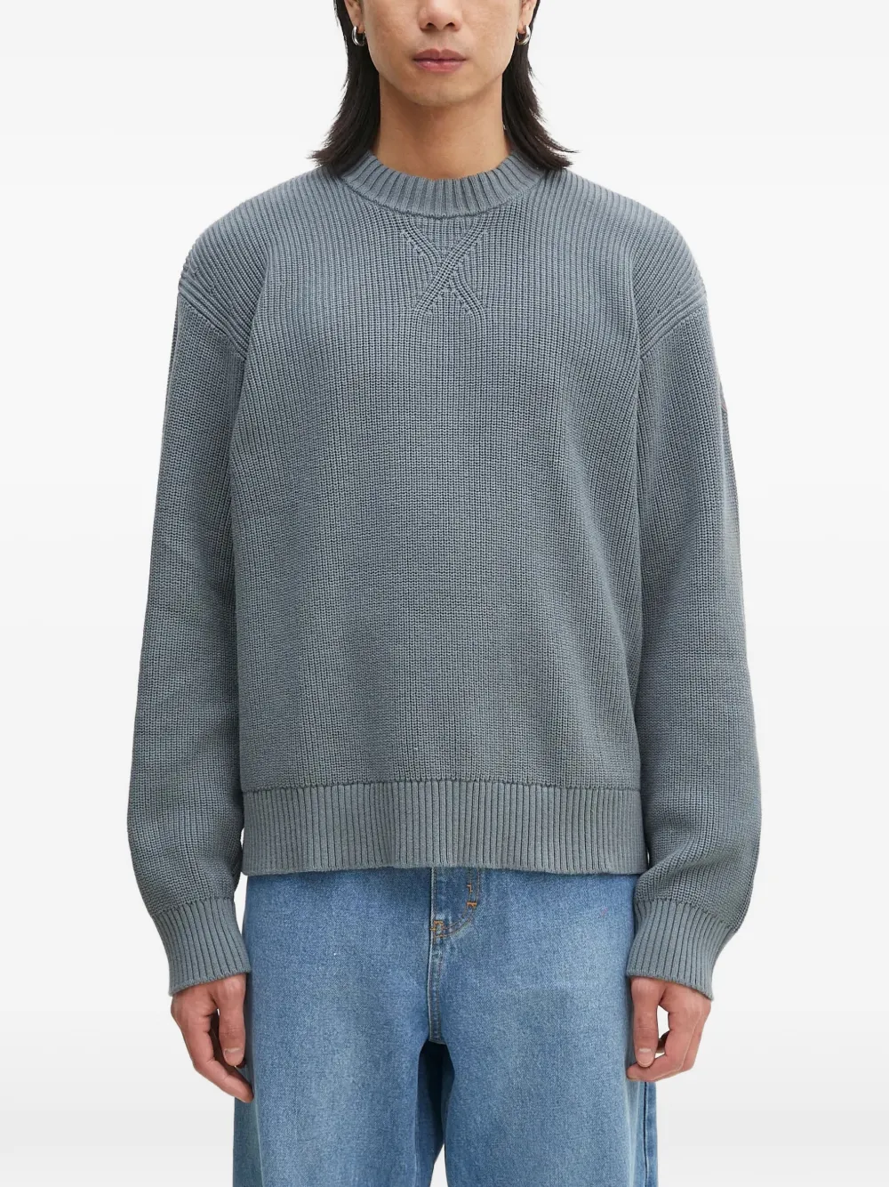 Серый вязаный пуловер в рубчик с круглым вырезом, длинными рукавами и нашивкой с логотипом