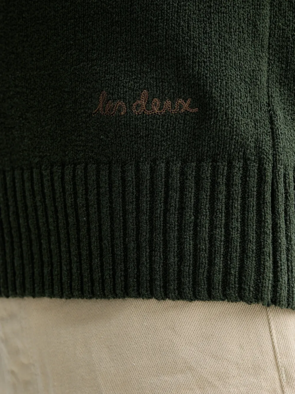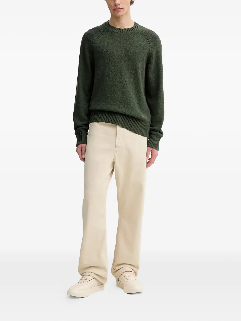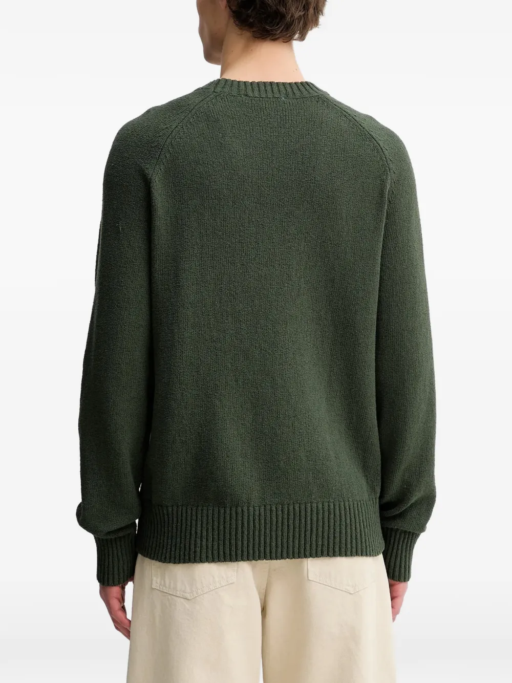 Зеленый цвет, ребристые манжеты, круглый вырез, вышитый логотип, длинные рукава