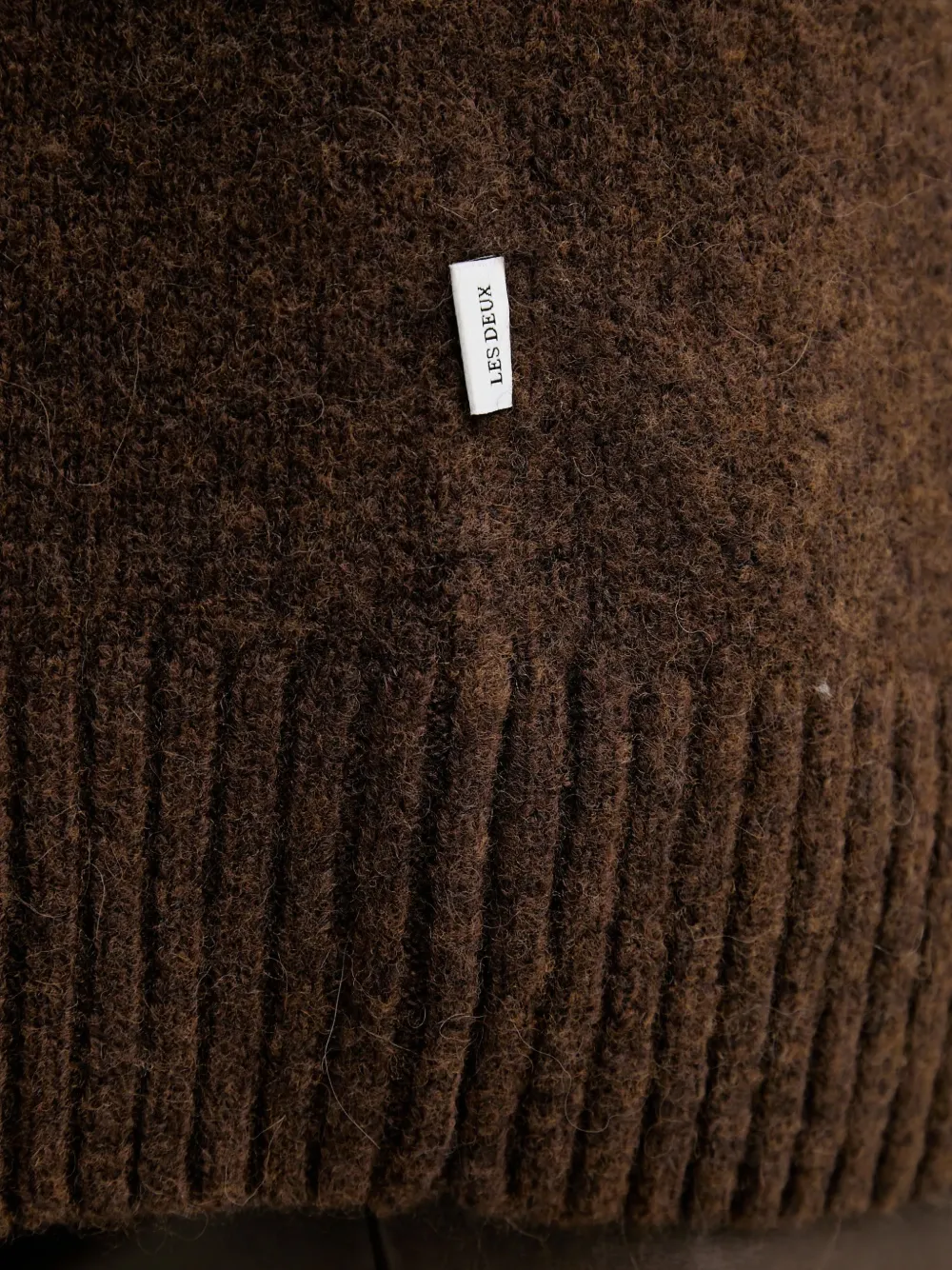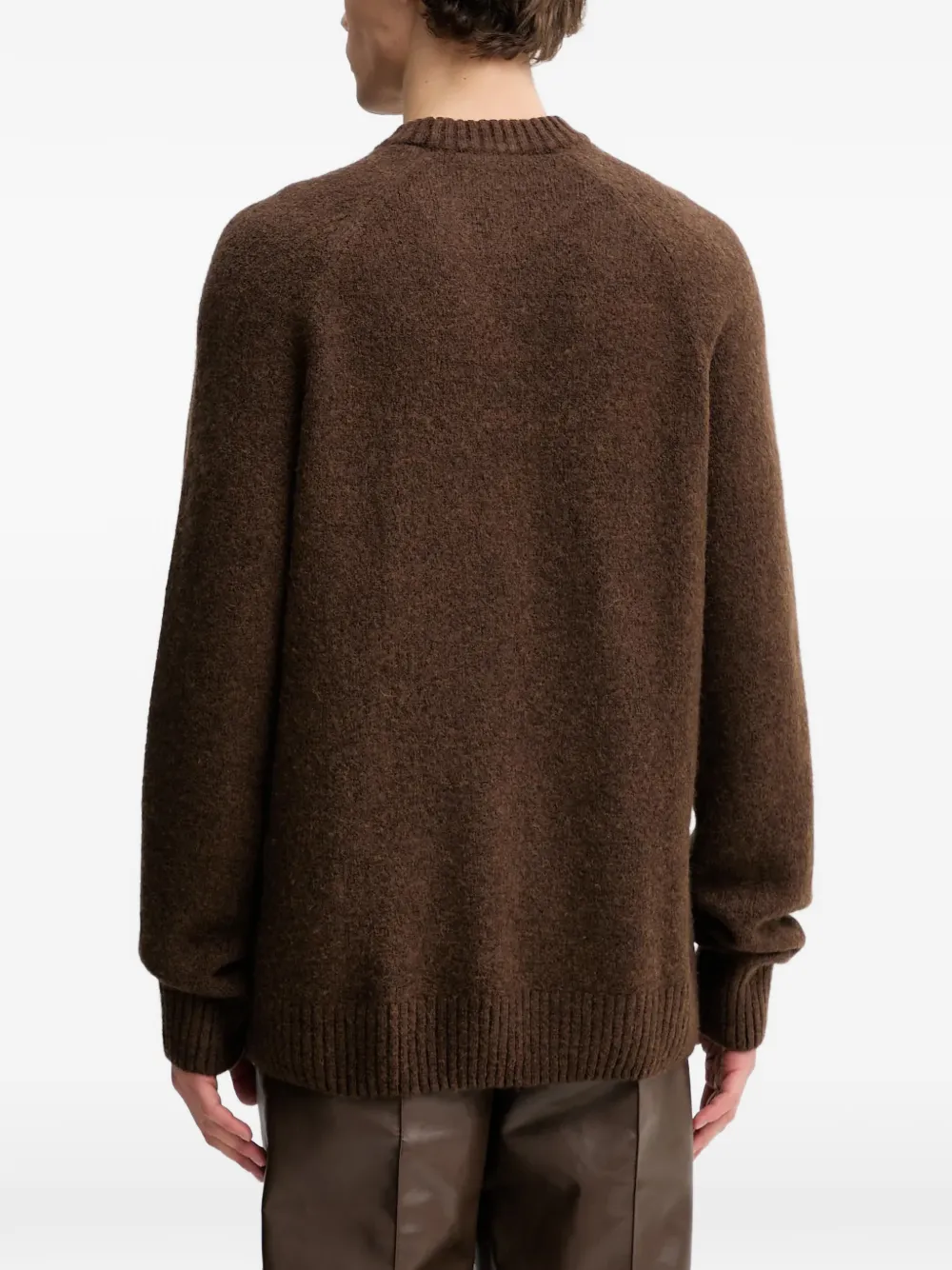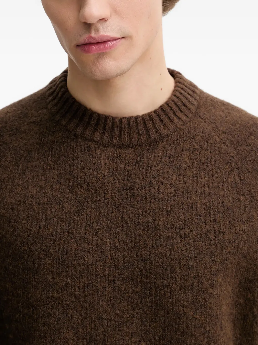 Коричневый свитер с круглым вырезом, длинными рукавами, рубчатым низом и манжетами