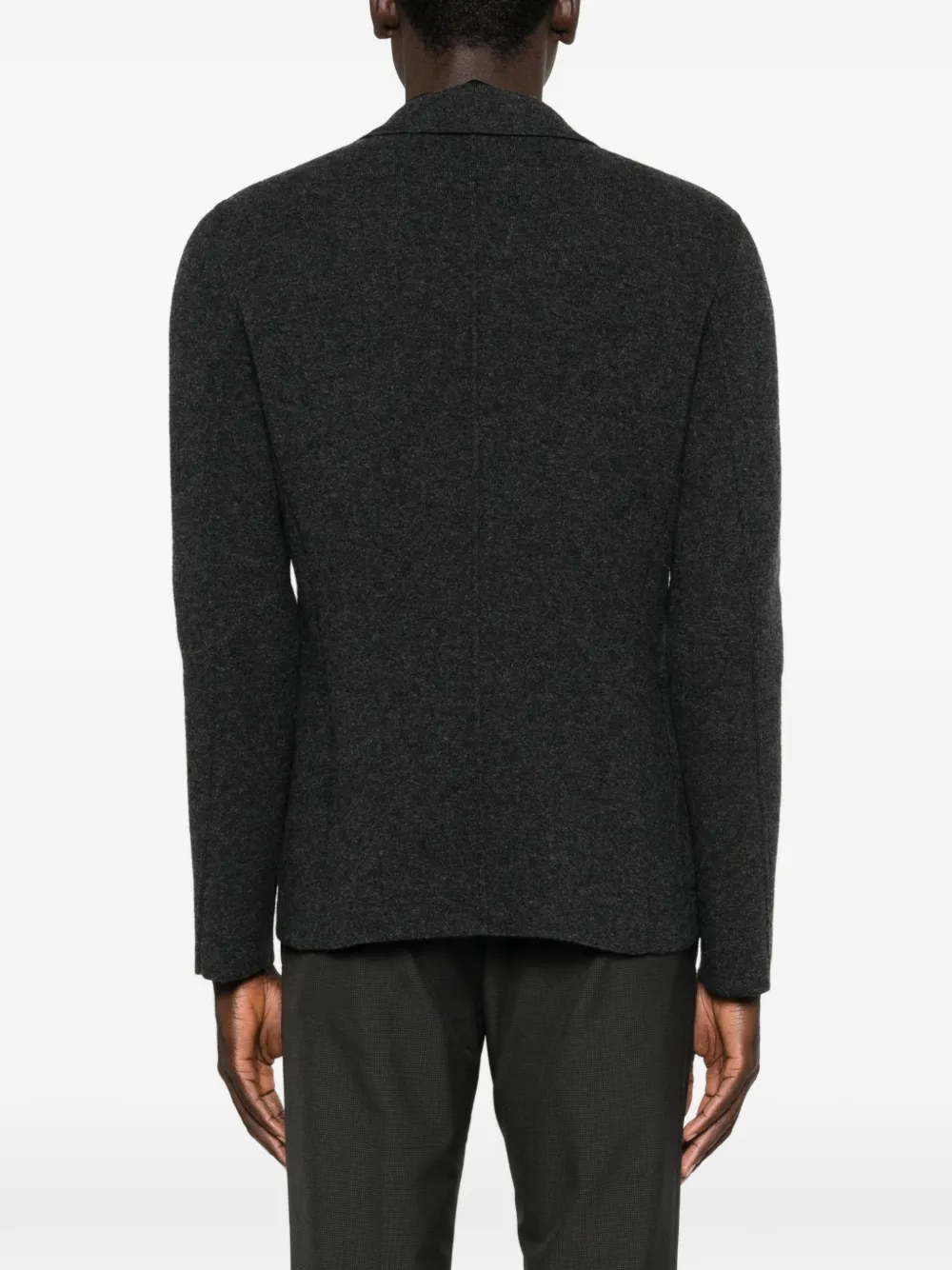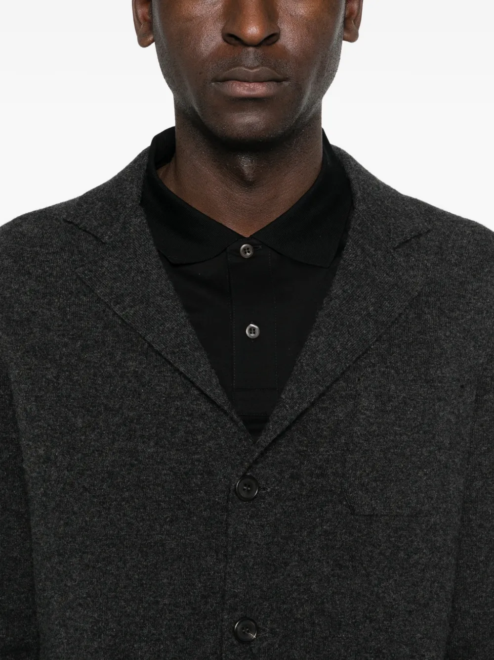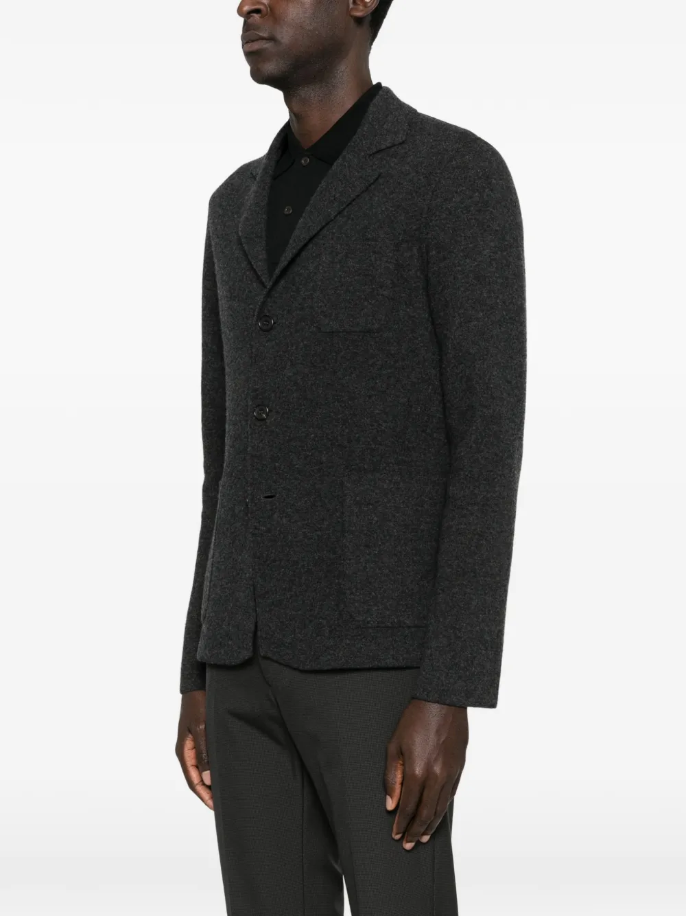 Темно-серый цвет, лацканы с вырезом, застежка на пуговицы спереди, длинные рукава, нагрудный прорезной карман, два фронтальных кармана