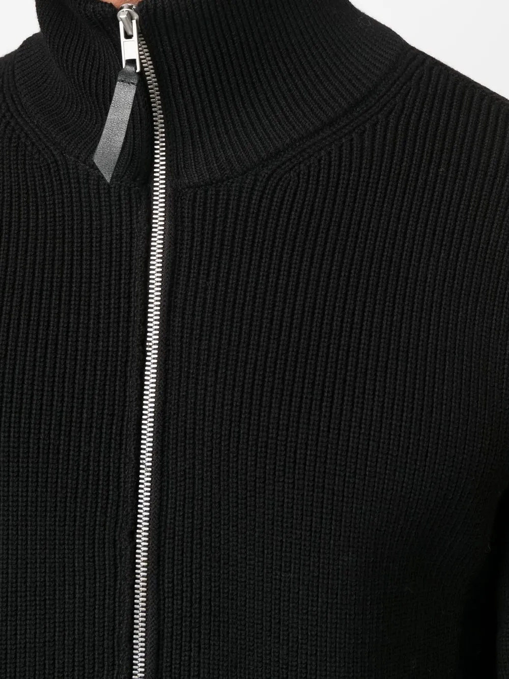 • Черный, смесь хлопка и шерсти, трикотаж в рубчик, кожаная отделка, высокий воротник, застежка на молнии спереди, длинные рукава и прямой подол.