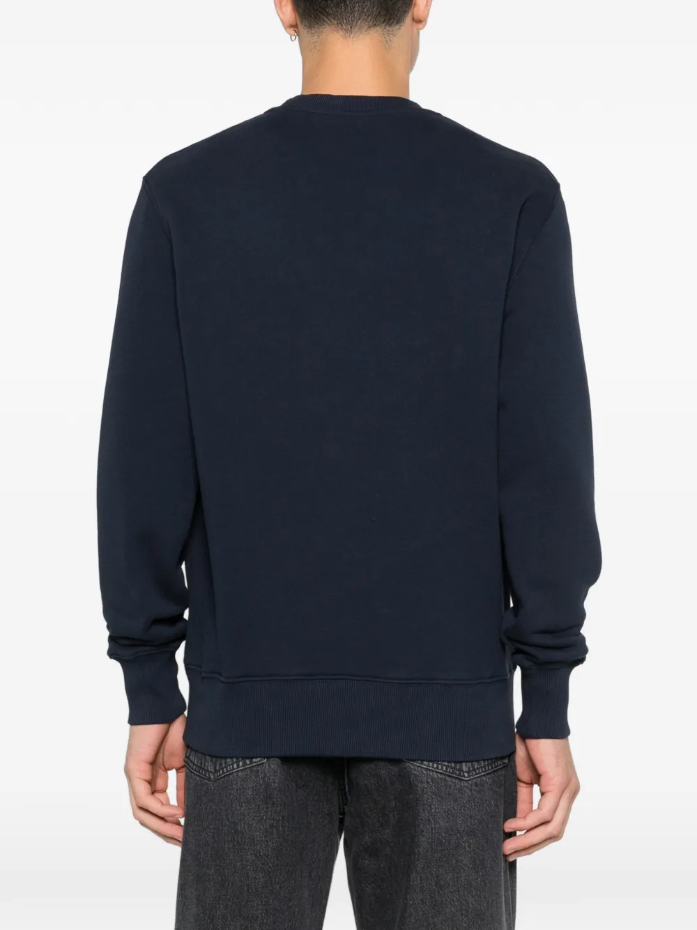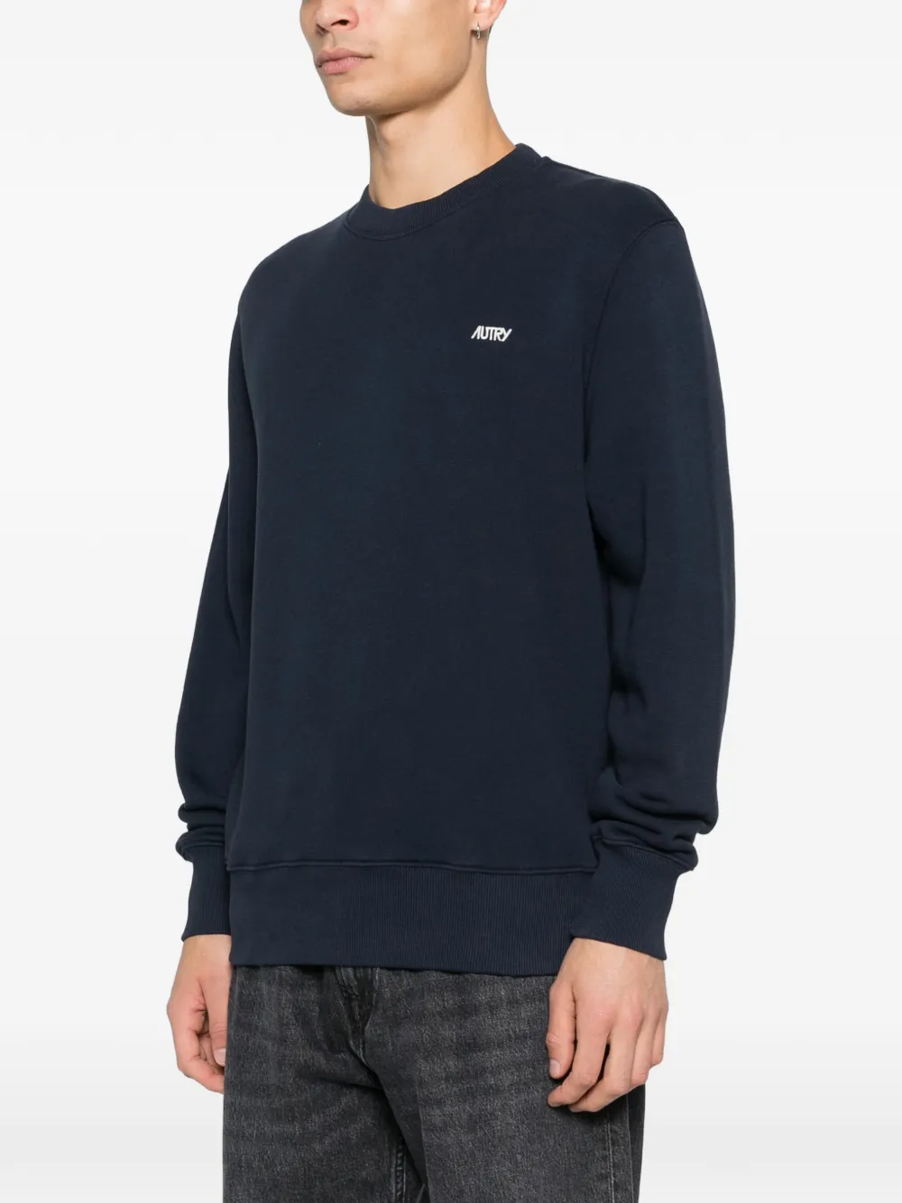 Синий свитшот с вышивкой логотипа, круглый вырез, длинные рукава, ребристые манжеты, ребристый нижний край