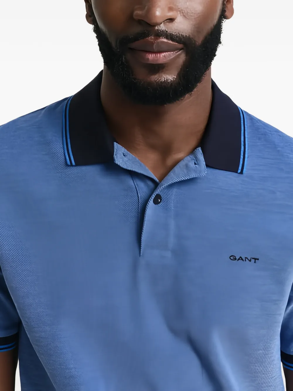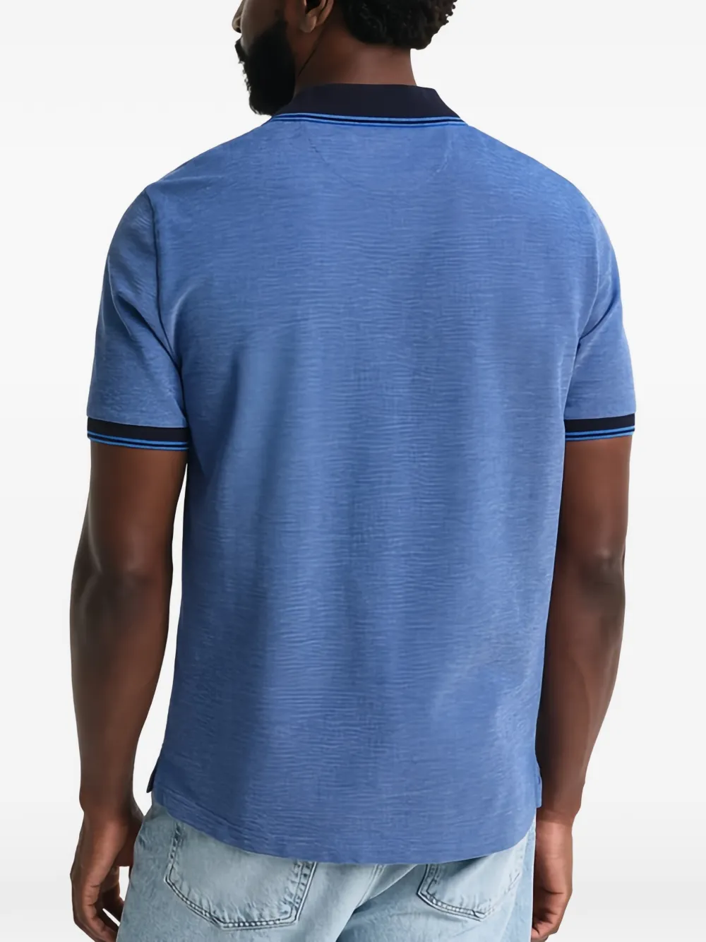 Синее поло с контрастным воротником, короткими рукавами с контрастными манжетами, поло-воротником и застежкой на пуговицы спереди