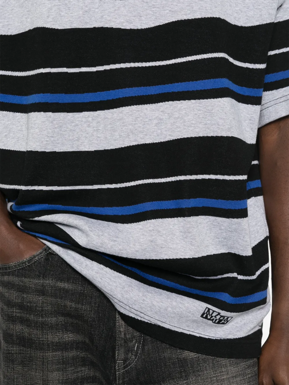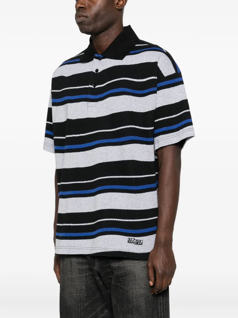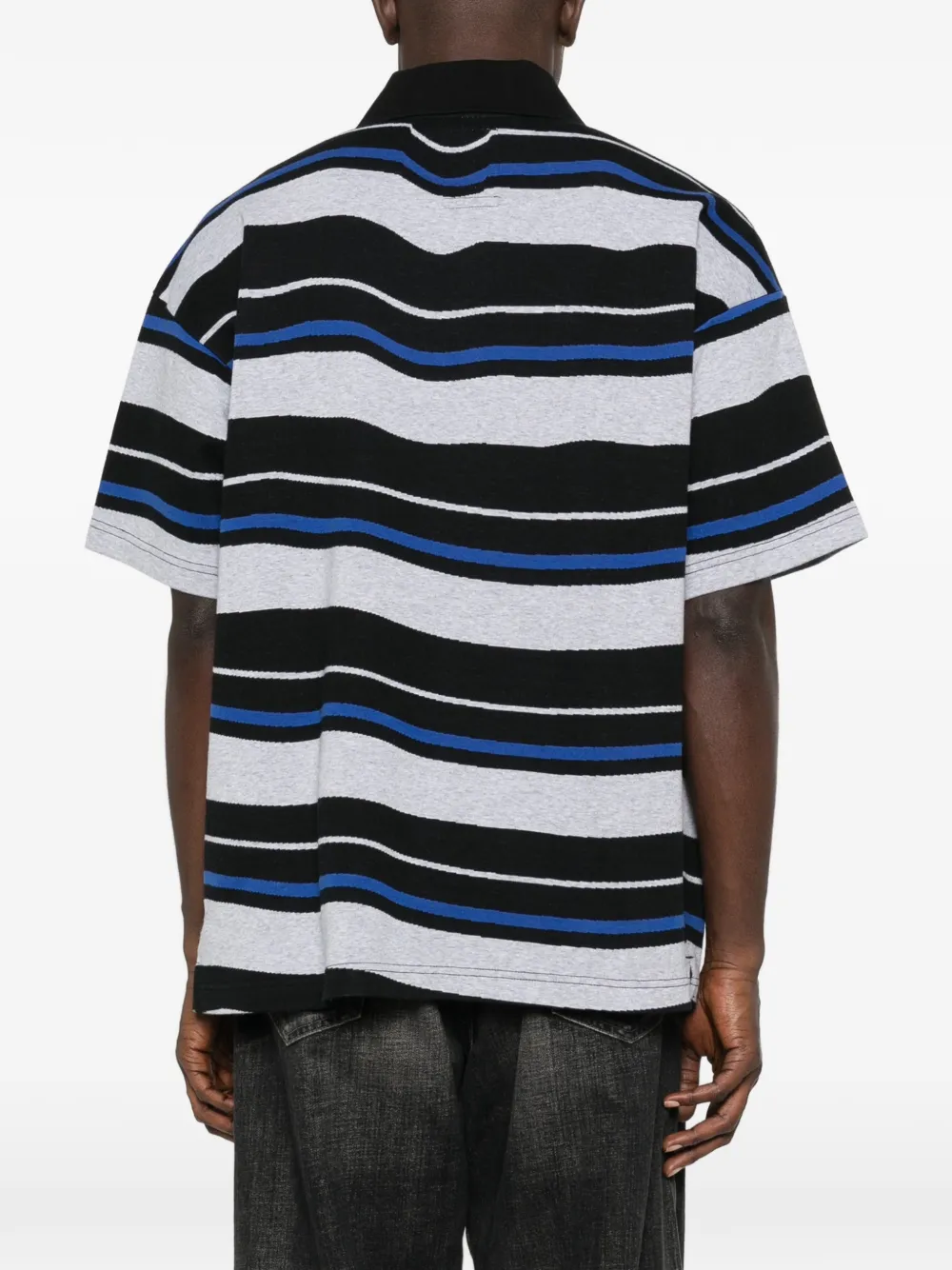 Серое полосатое поло с воротником, застежкой на пуговицы и короткими рукавами