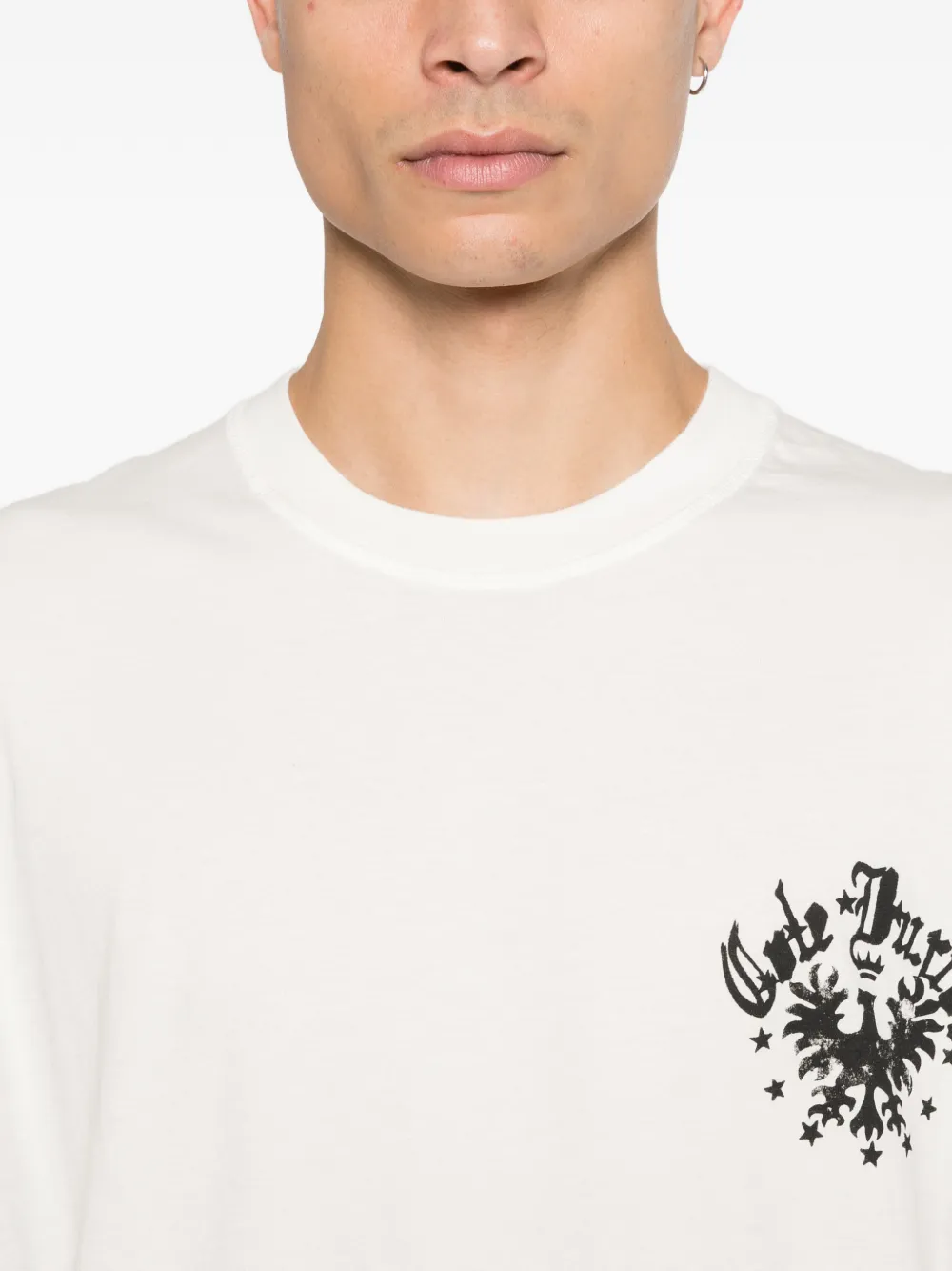 Белая футболка с графическим принтом, круглым вырезом, короткими рукавами и прямым подолом