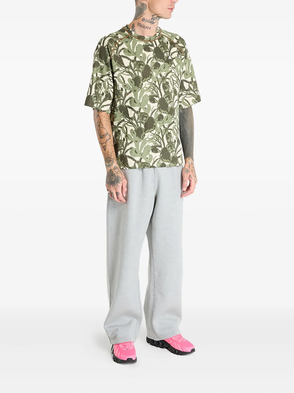 Зеленая футболка с принтом по всему изделию, короткими рукавами, круглым вырезом и тональной строчкой