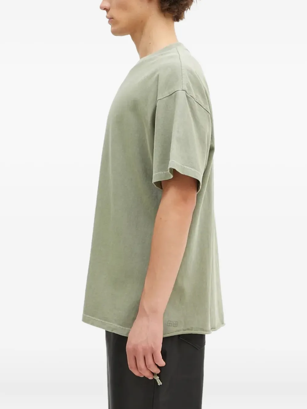 Зеленая футболка с логотипом, круглым вырезом, короткими рукавами и необработанным краем