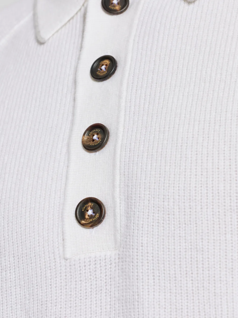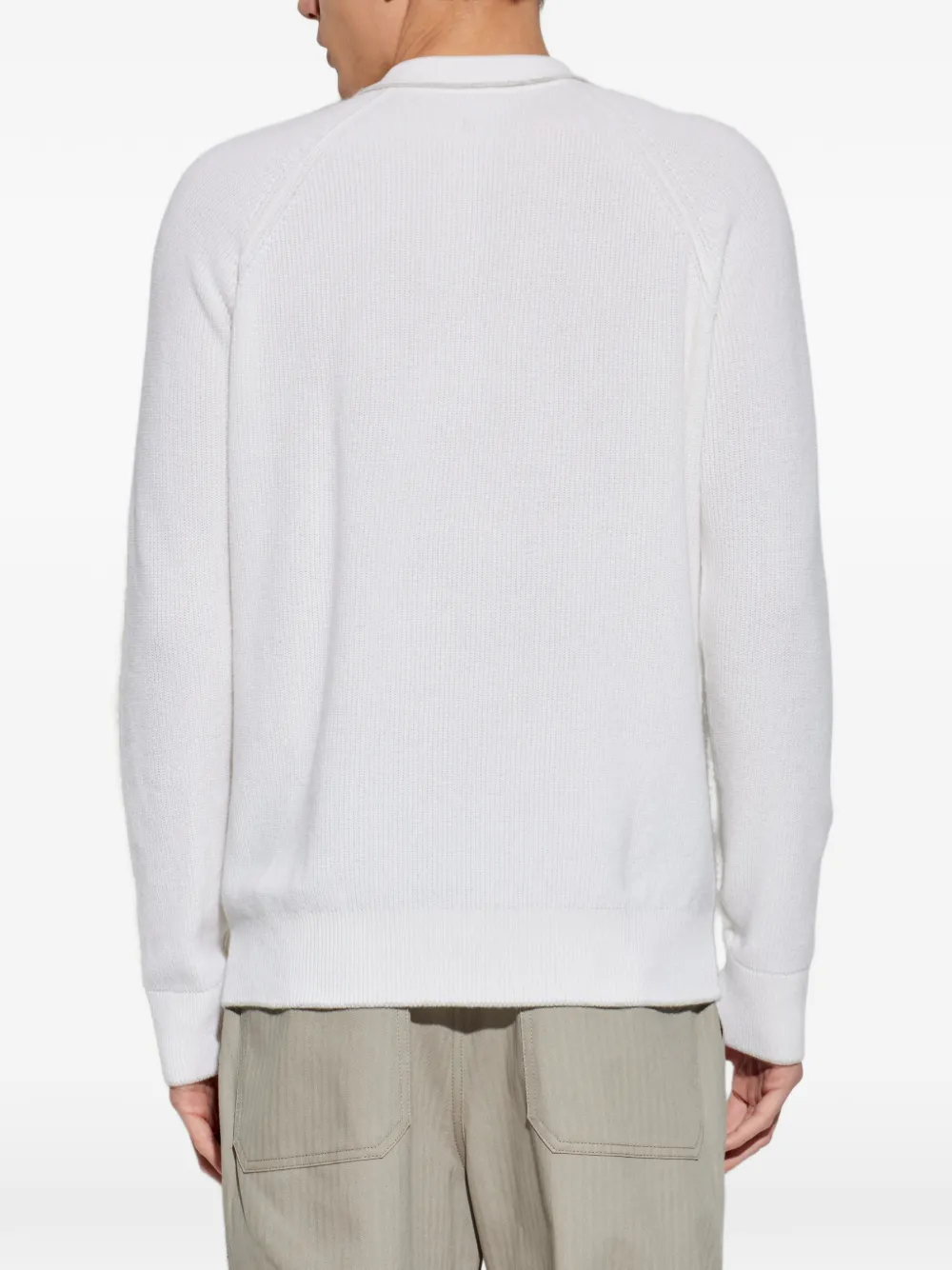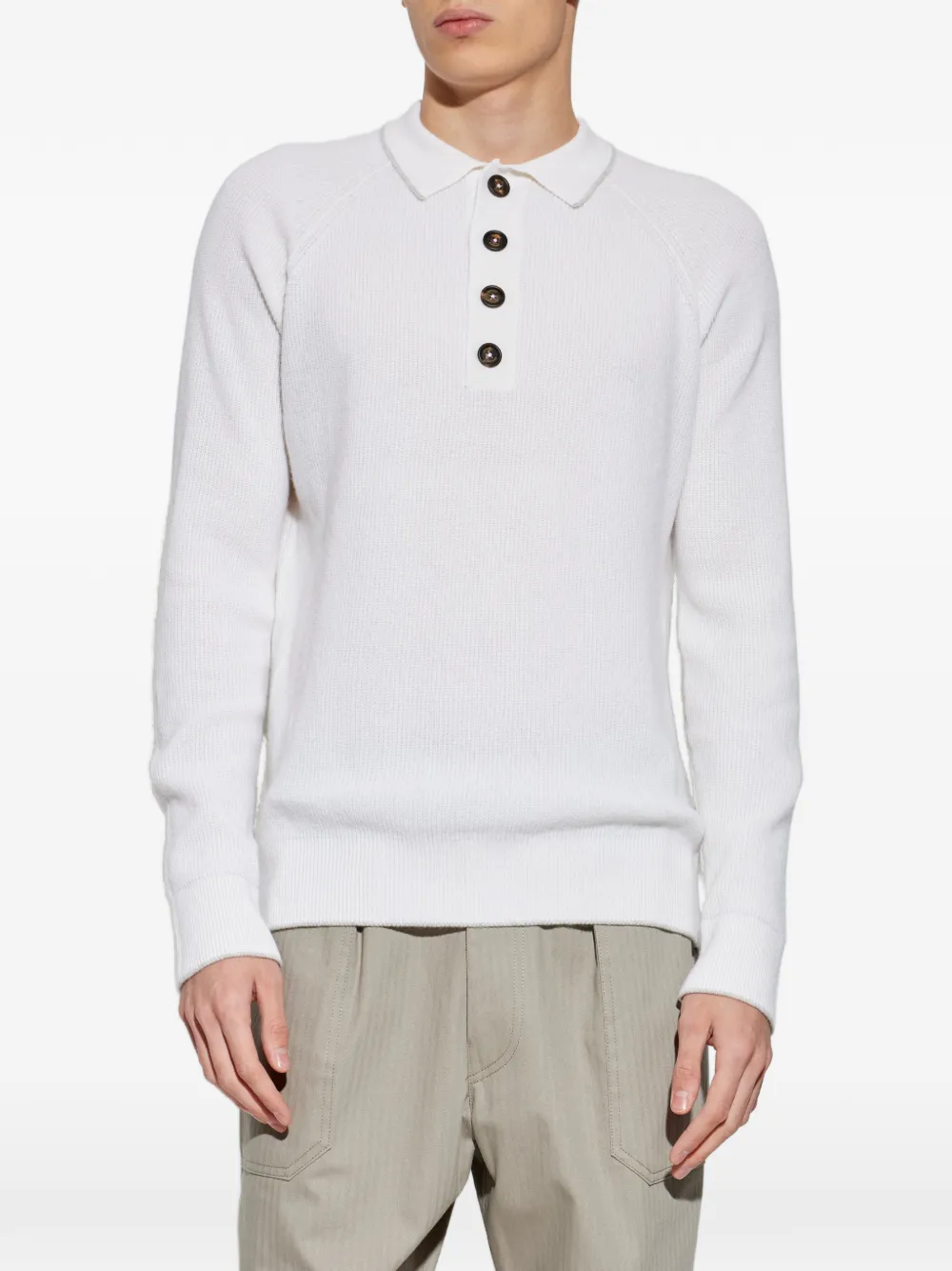 Белый воротник с планкой на пуговицах, длинные рукава, рубчатая вязка
