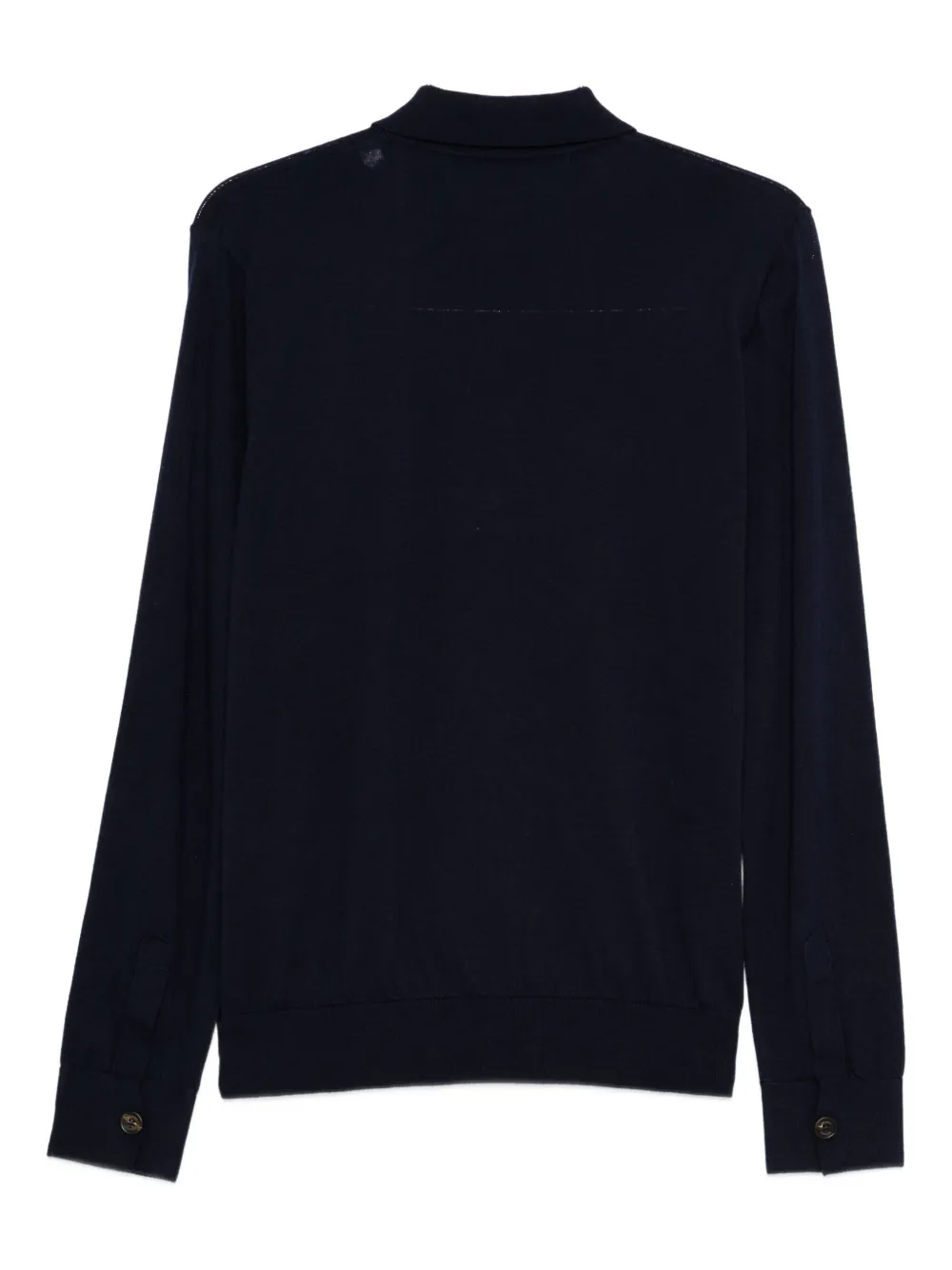 Темно-синяя рубашка-поло с длинными рукавами, застежкой на пуговицы, воротником-поло, ребристыми манжетами и прямым подолом