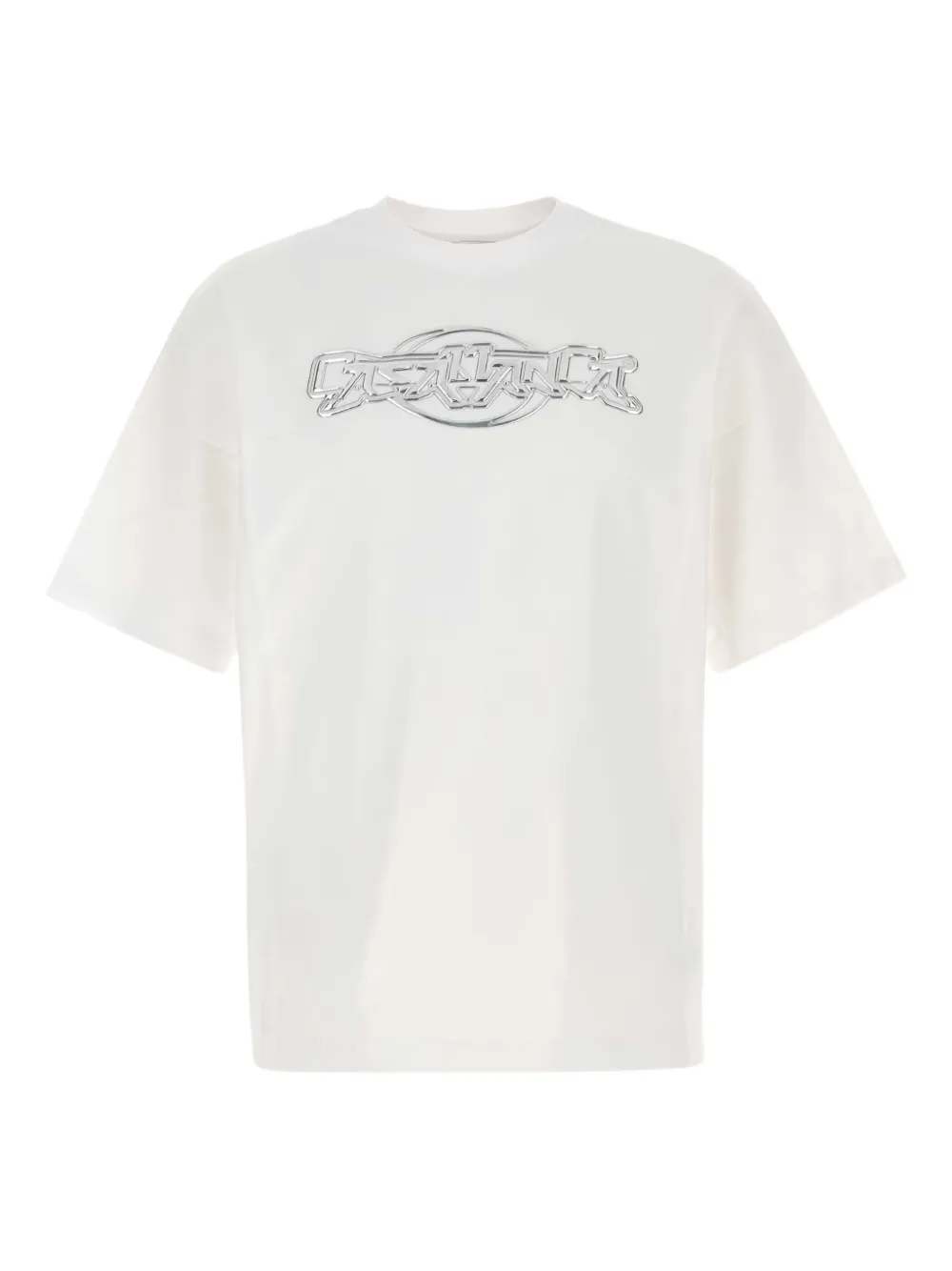 Белая футболка с логотипом, короткими рукавами и круглым вырезом