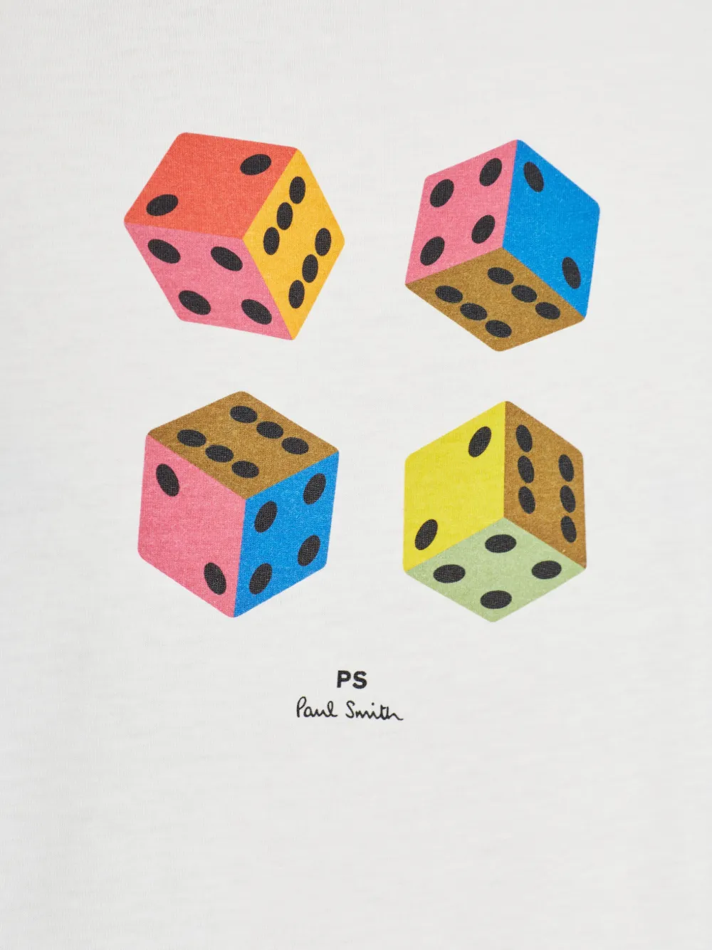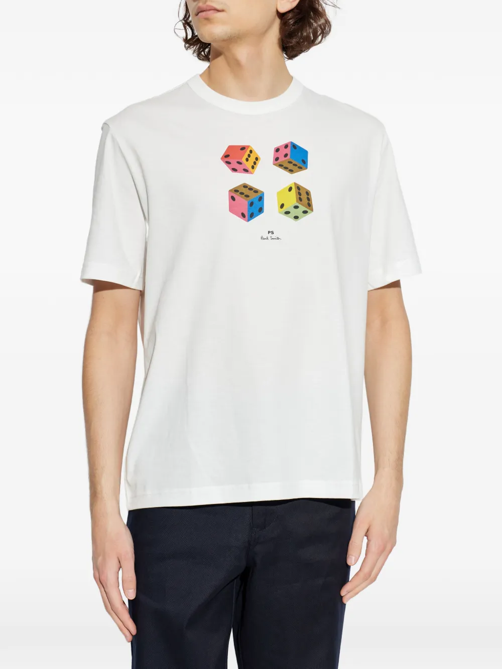 Белая футболка с круглым вырезом, короткими рукавами, принтом с изображением игральных костей и прямым подолом