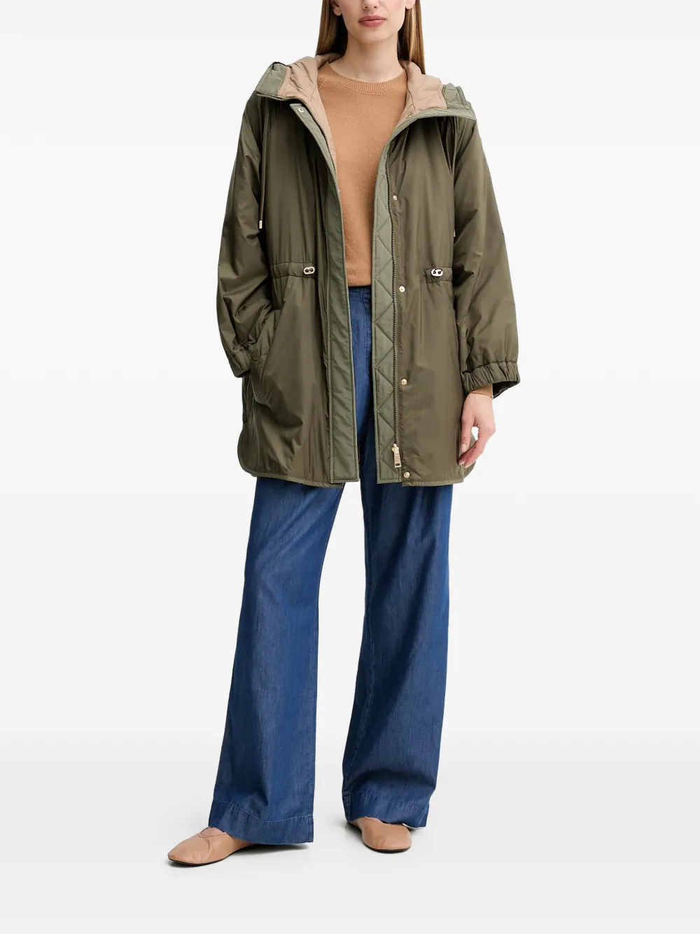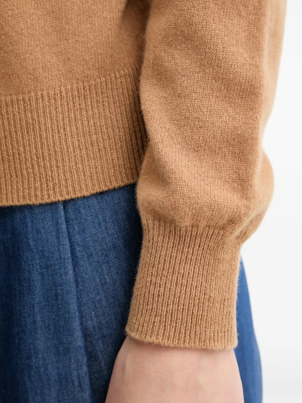 Коричневый цвет, ребристый низ, круглый вырез, длинные рукава, ребристые манжеты, небольшой металлический логотип сзади