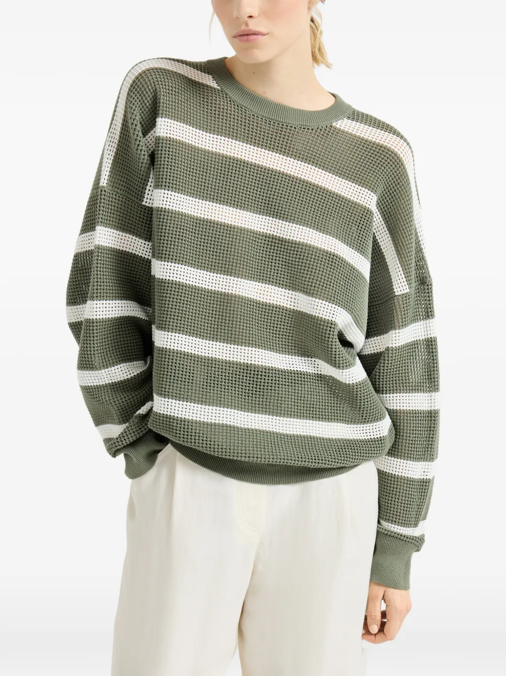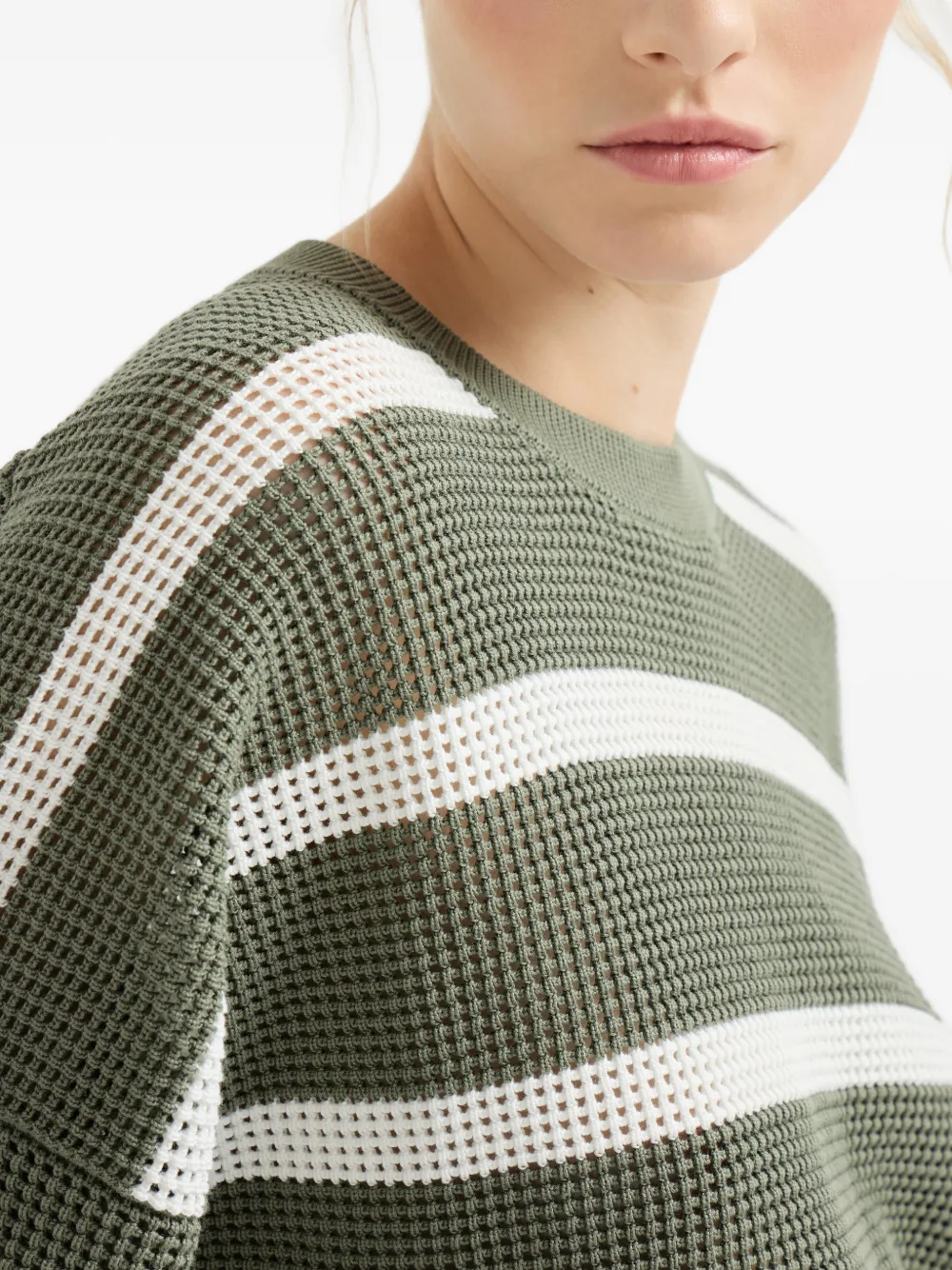 Зеленый хлопковый джемпер в полоску с круглым вырезом, вязаной резинкой на манжетах и по краю