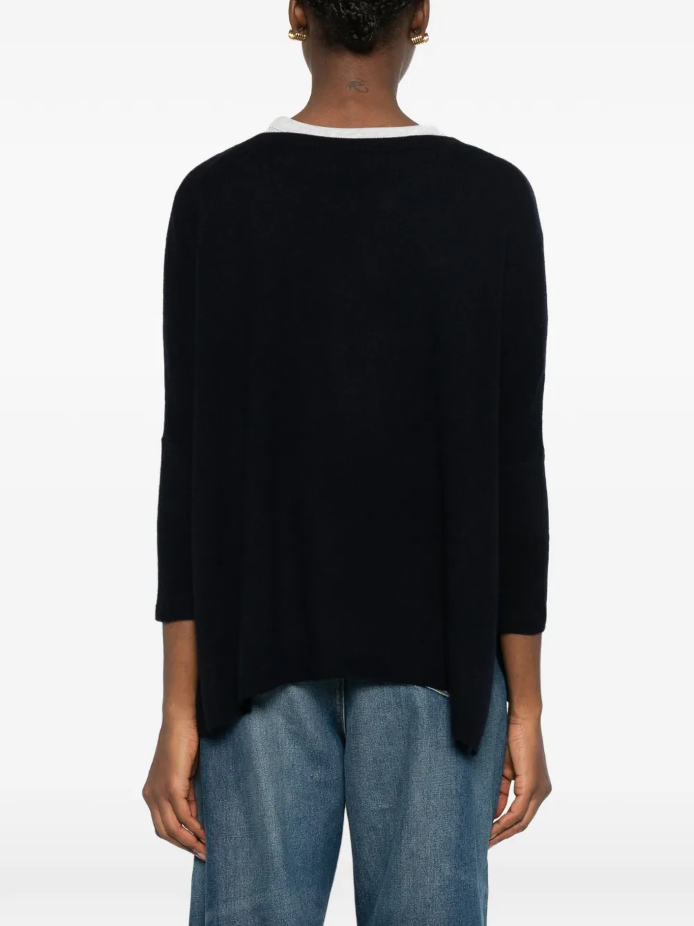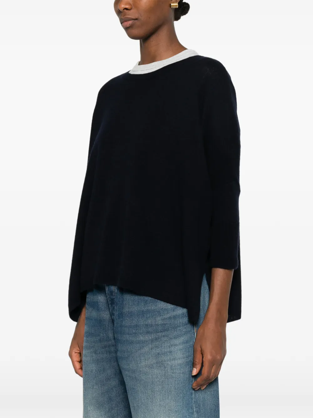 Синий джемпер с круглым вырезом, рукавами три четверти, ребристой отделкой низа и манжет, прямой низ
