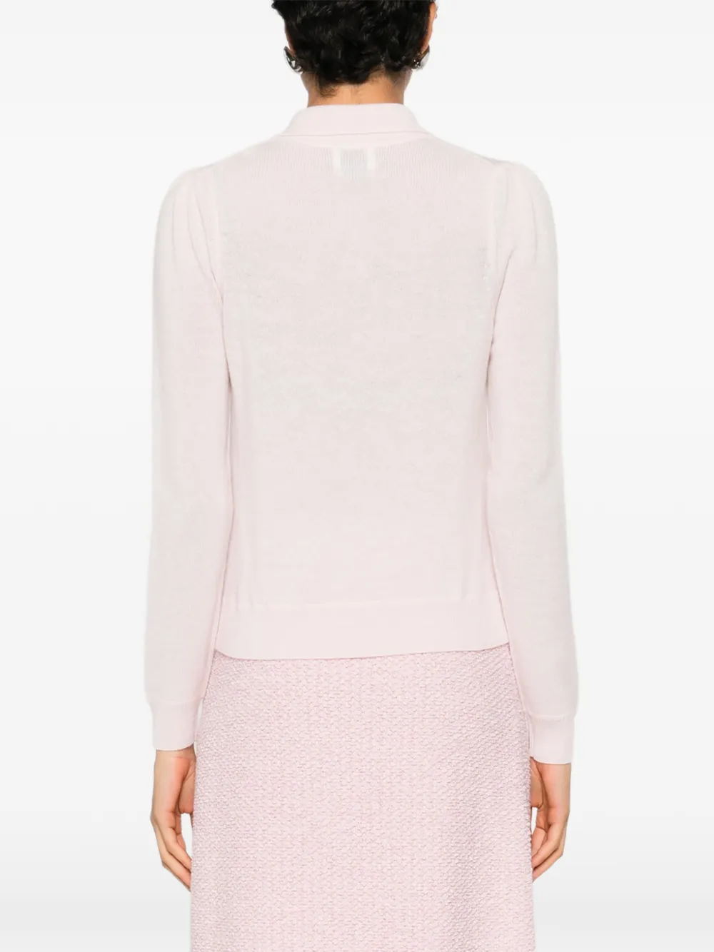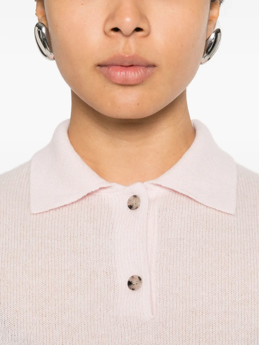 Светло-розовый пуловер с воротником-поло, застежкой на пуговицы, длинными рукавами, ребристым низом и манжетами