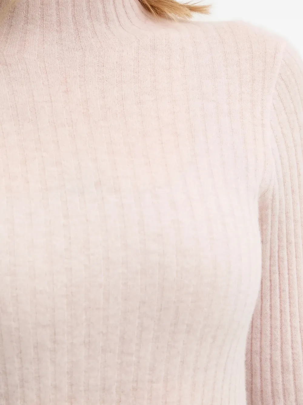 Светло-розовый трикотаж в рубчик с длинными рукавами, воротником-стоойкой и прямым краем