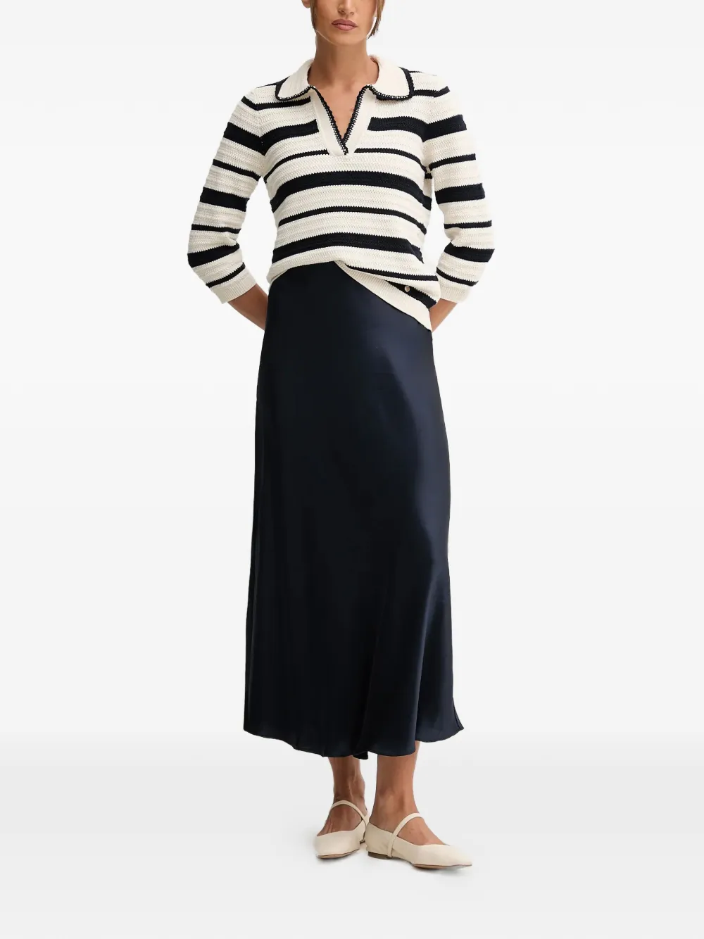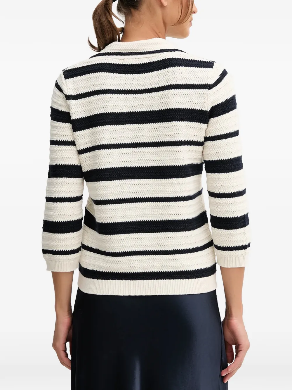 Белая и синяя полосатая блуза с рукавами три четверти и V-образным вырезом