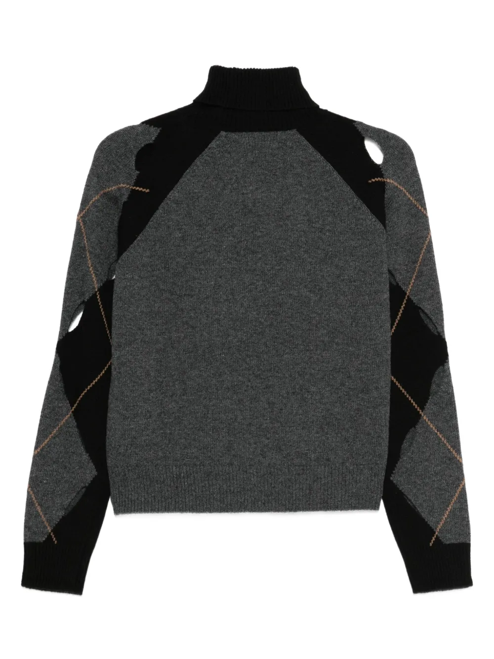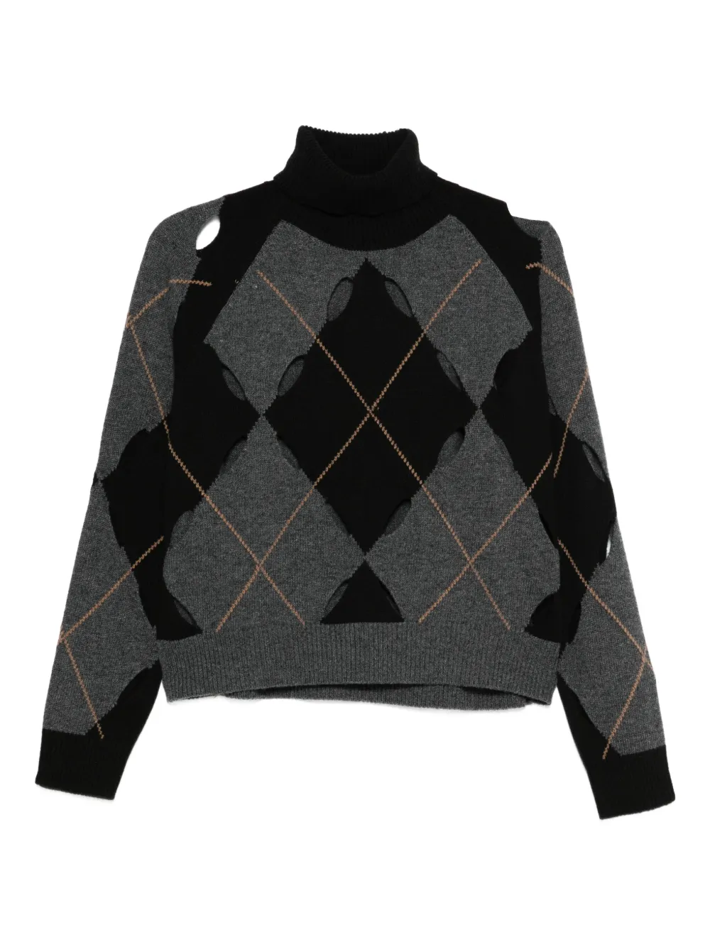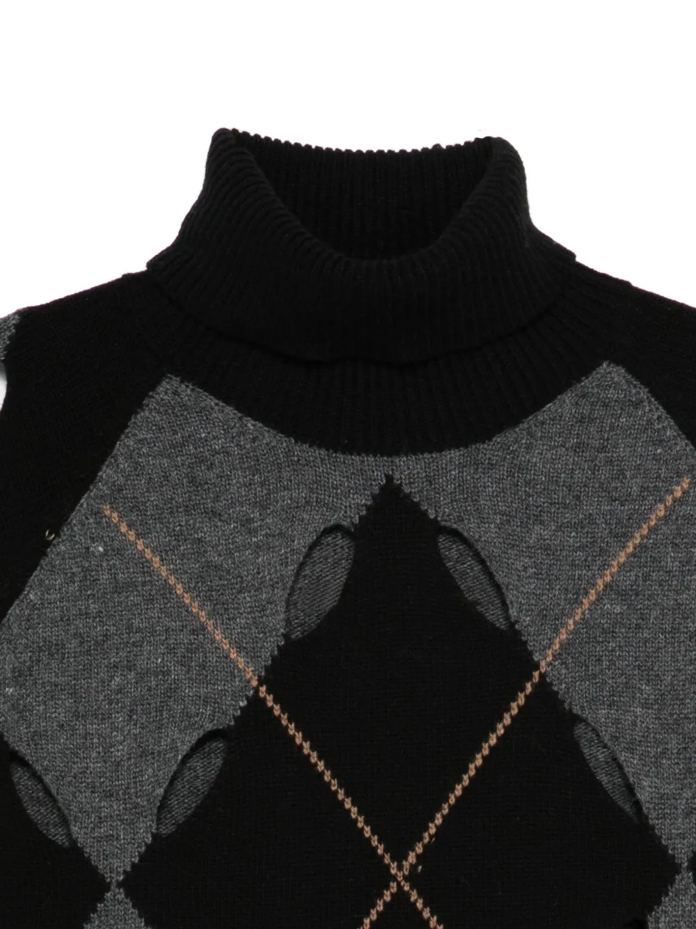 Черный свитер с ромбовидным узором, вырезами, воротником-гольф, длинными рукавами и ребристыми краями