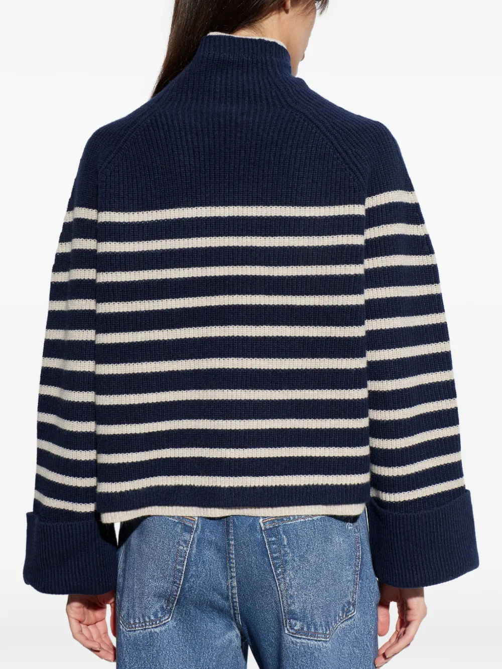 Темно-синий свитер с полосатым узором, воротником-стойкой и рукавами с манжетами