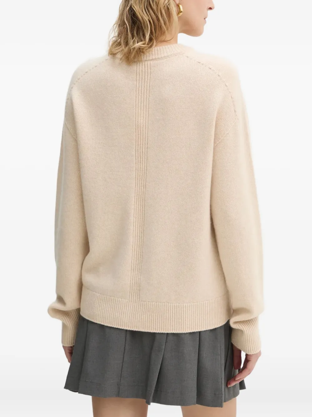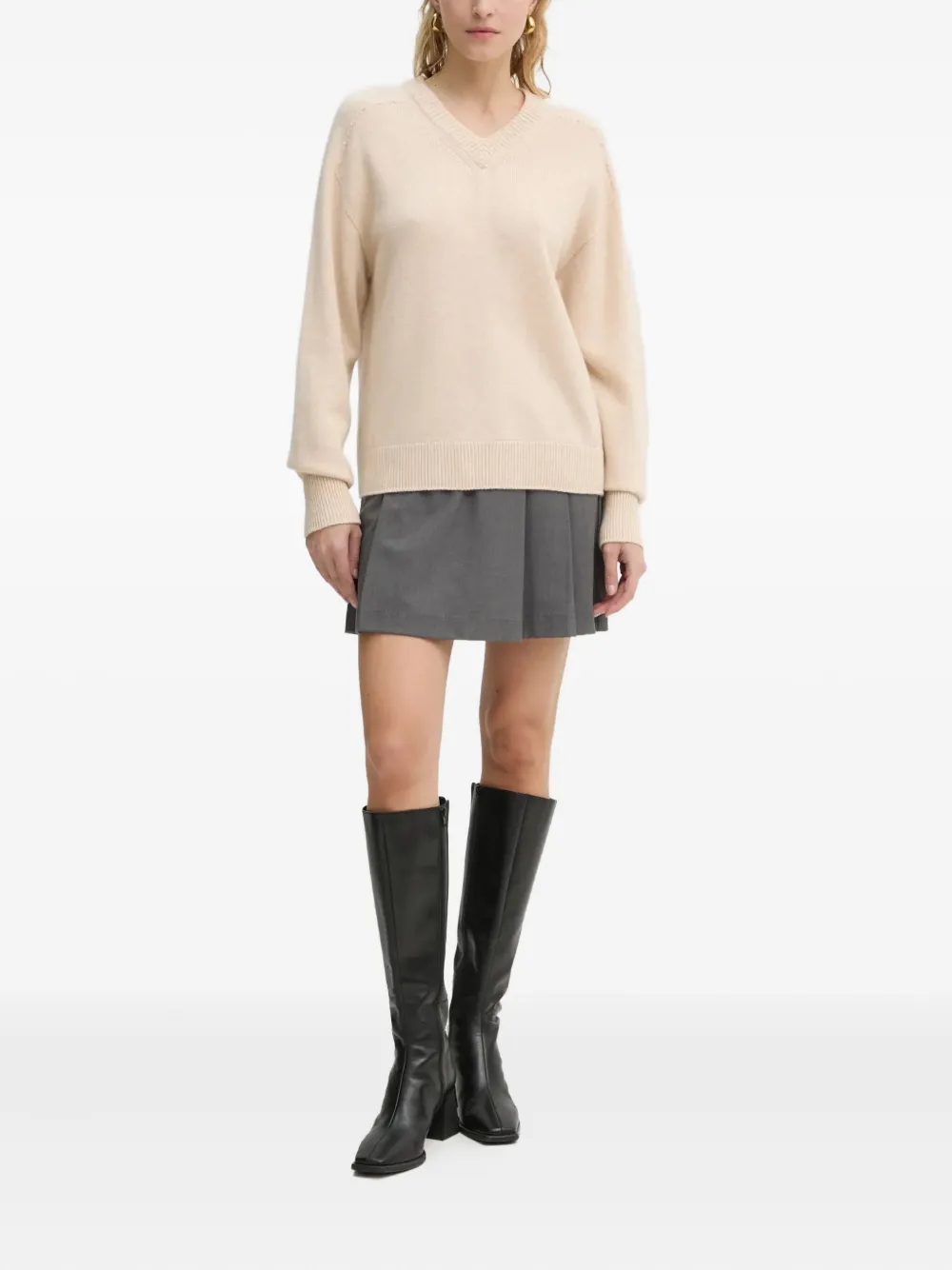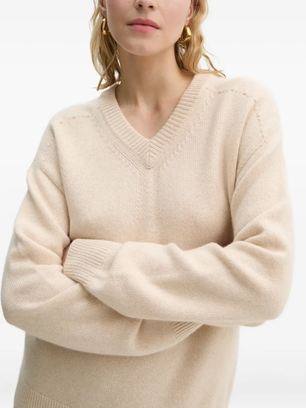 Бежевый V-образный вырез, длинные рукава, ребристая отделка