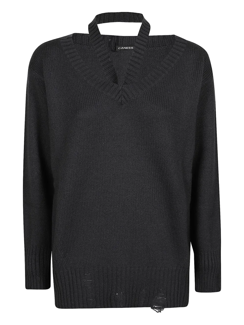 Черный кашемировый свитер с V-образным вырезом, потертым (декоративно состаренным) краем и длинными рукавами