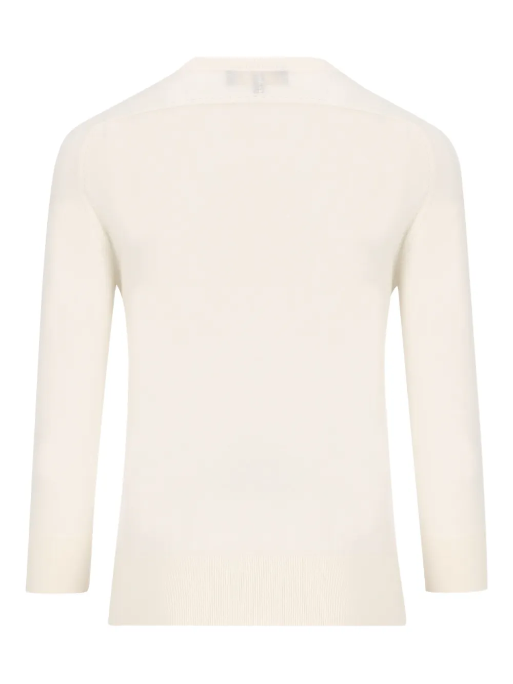 Кремово-белый цвет, ребристый подол, ребристые манжеты, круглый вырез, рукава длиной три четверти