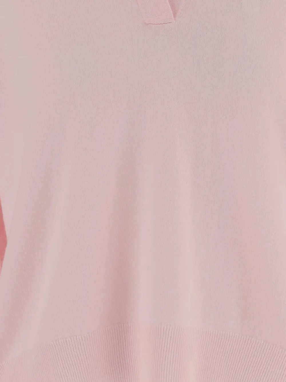 Розовые ребристые манжеты и подол, V-образный вырез, отложной воротник, длинные рукава