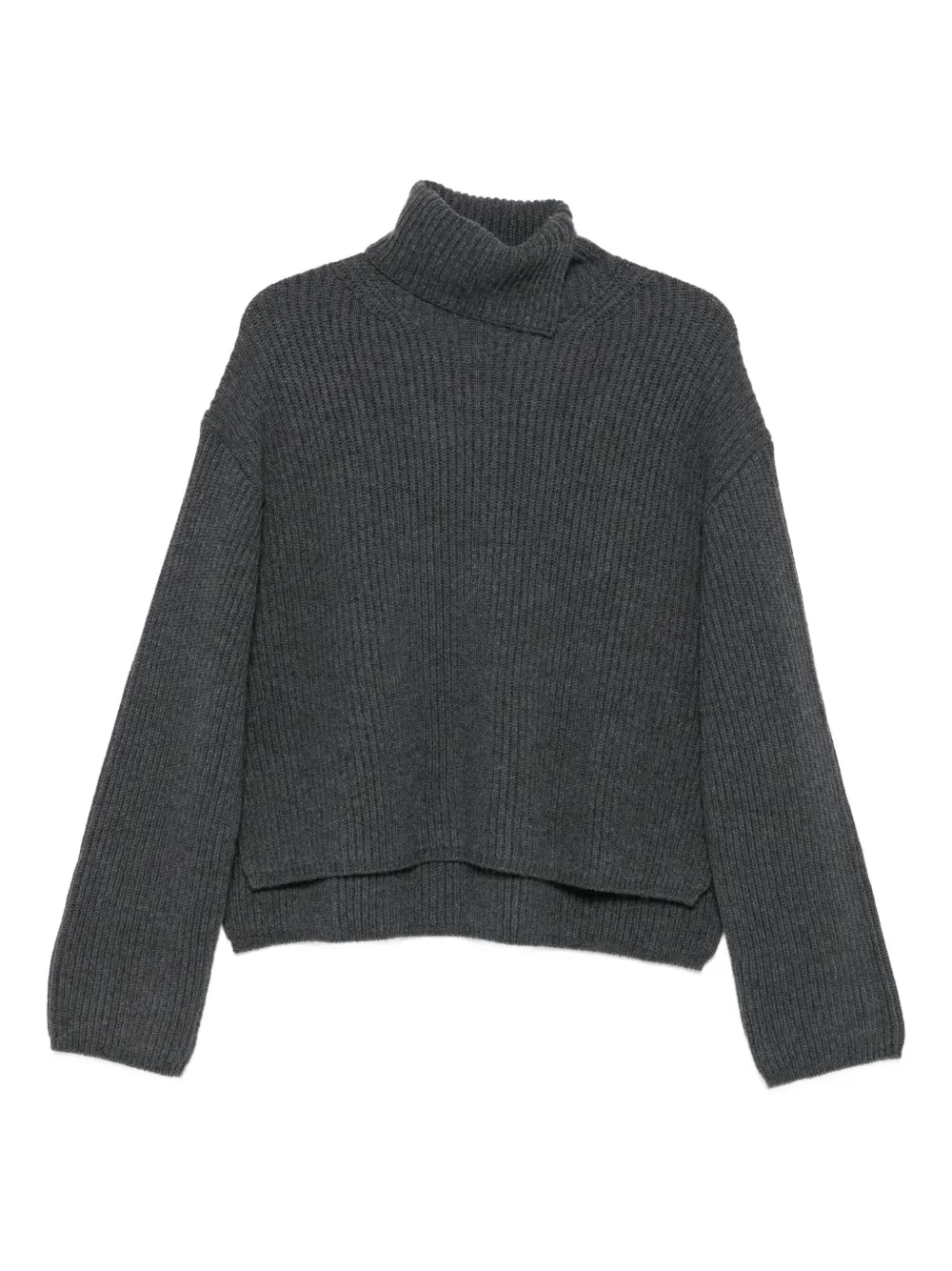 Темно-серый в рубчик, высокий ворот, длинные рукава, рукава-буфы, укороченный низ