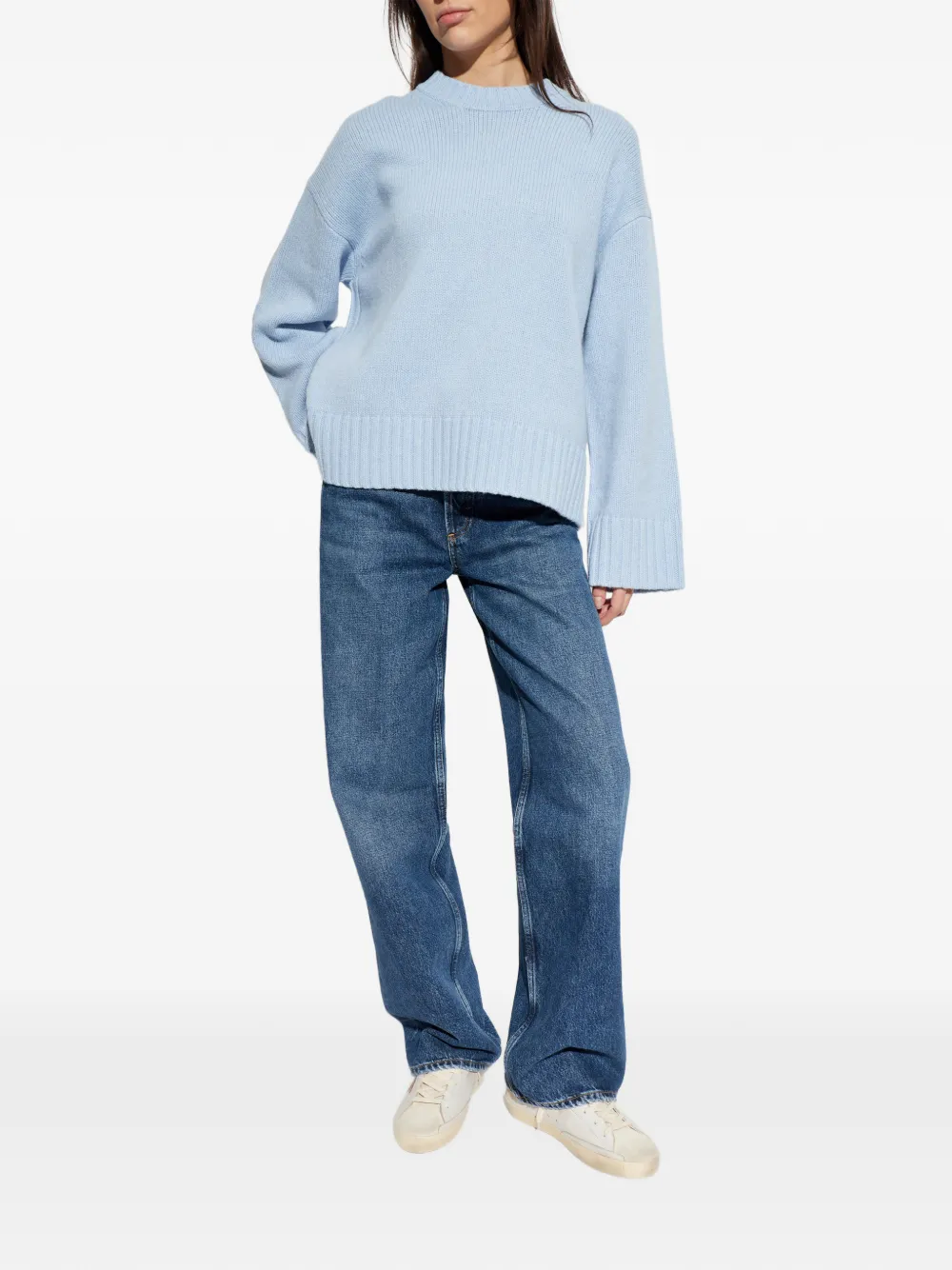 Синий джемпер с ребристой отделкой, круглым вырезом, длинными рукавами, прямым краем и тонкой вязкой