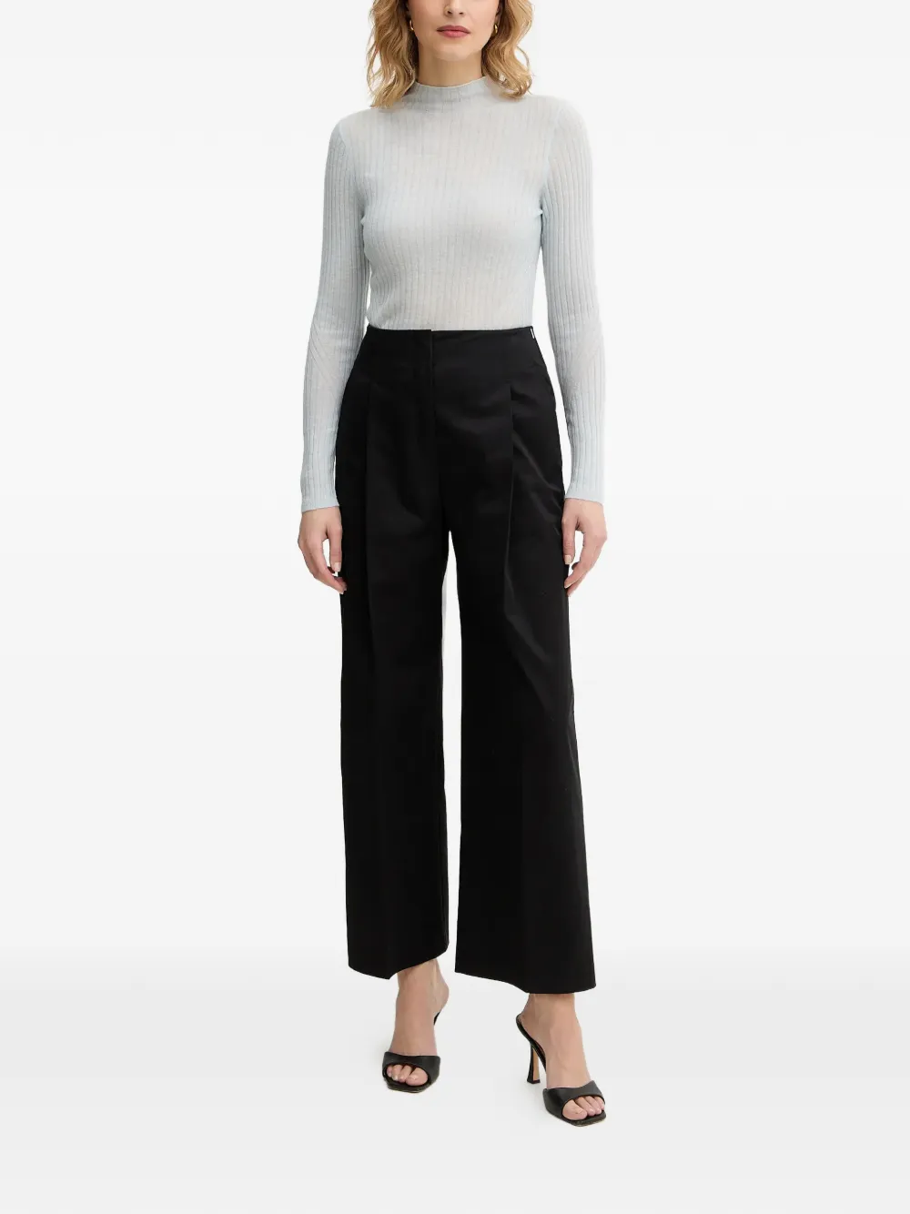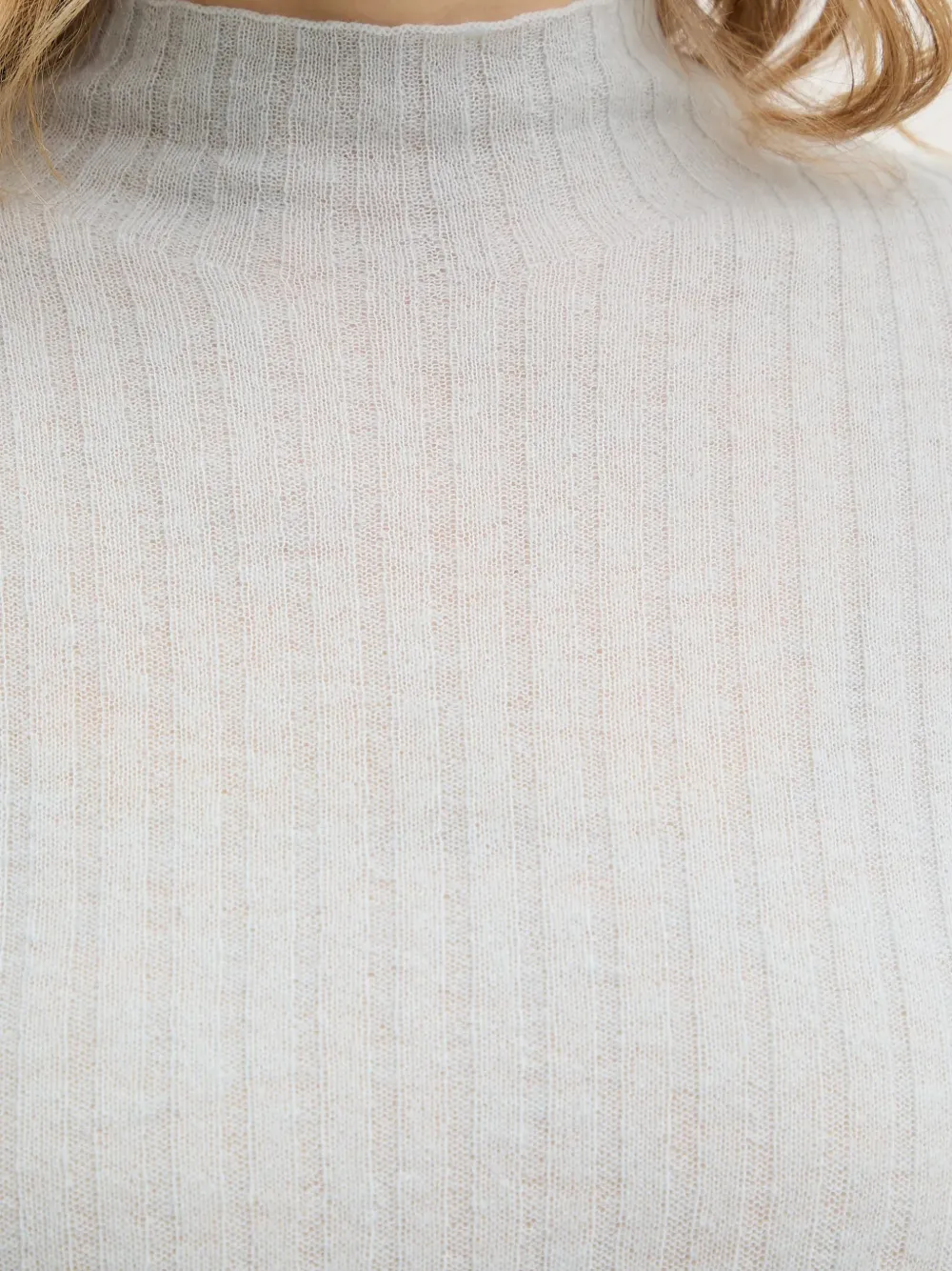 Синий вязаный свитер в рубчик с воротником-стойкой и длинными рукавами