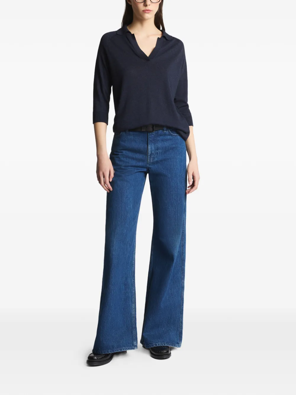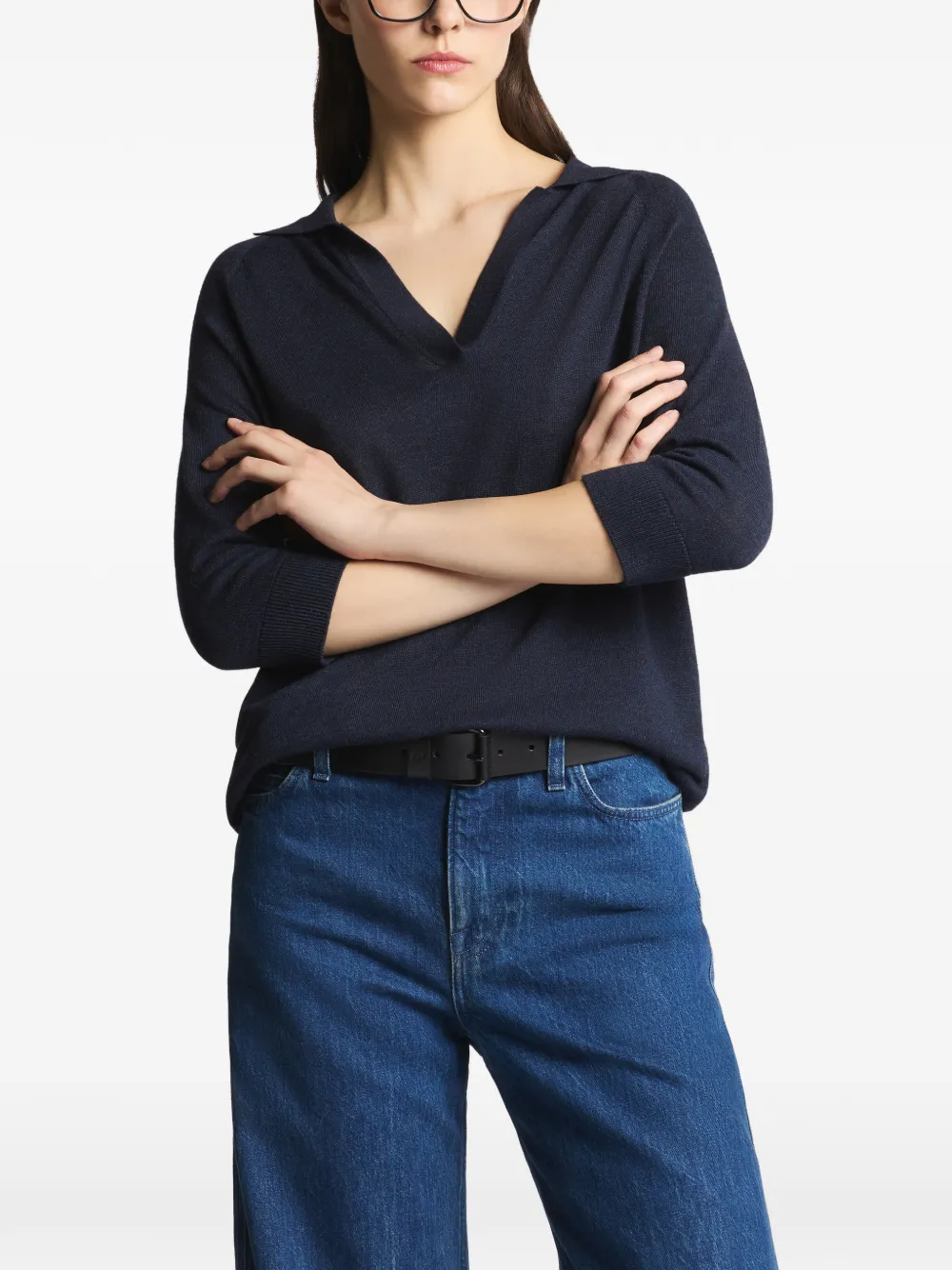 Темно-синее поло с воротником, V-образным вырезом, рукавами три четверти, ребристым низом, вязаное