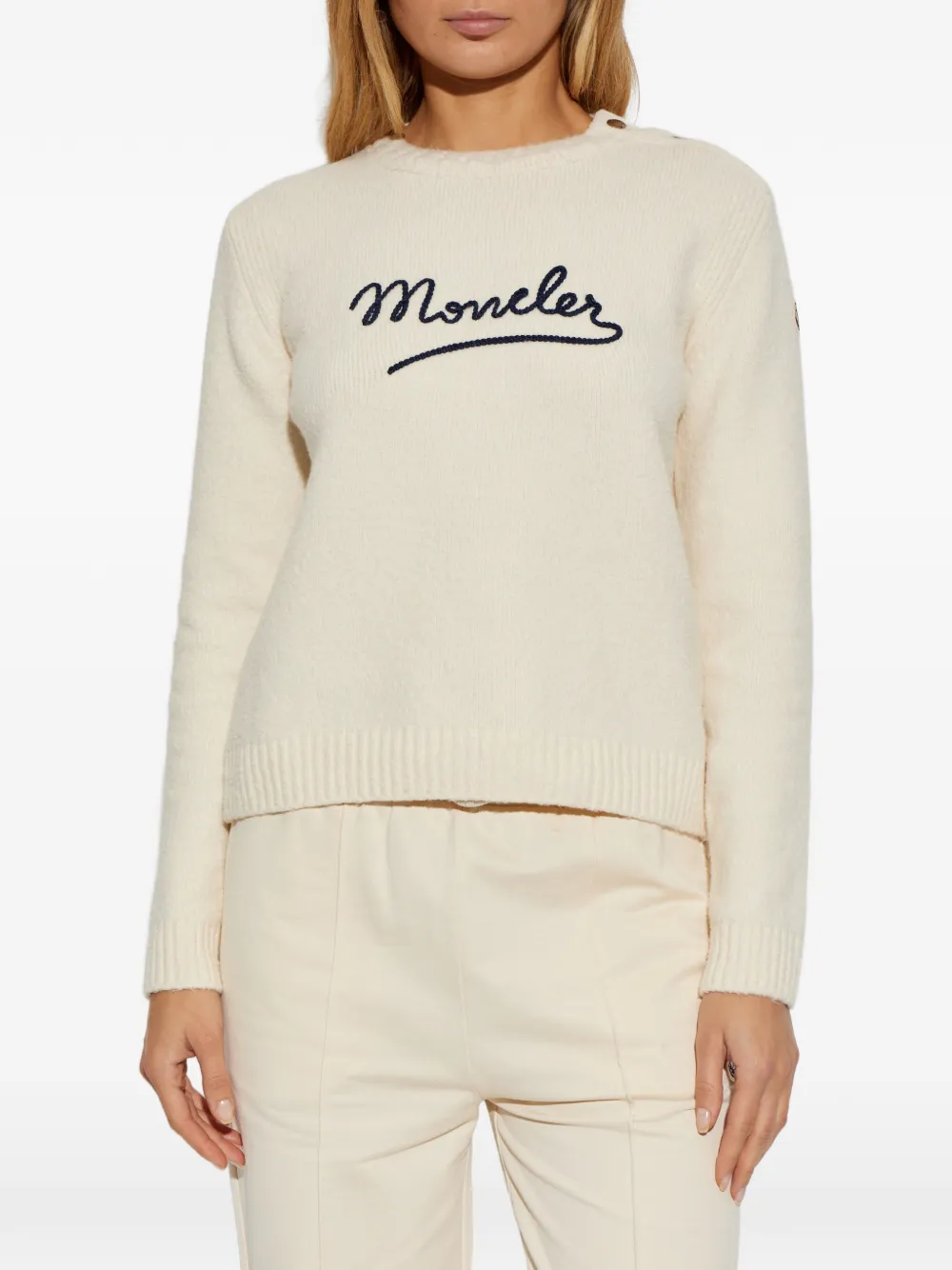 Кремовый свитшот с вышитым логотипом, пуговицами на плече, круглым вырезом, длинными рукавами и рубчатым краем