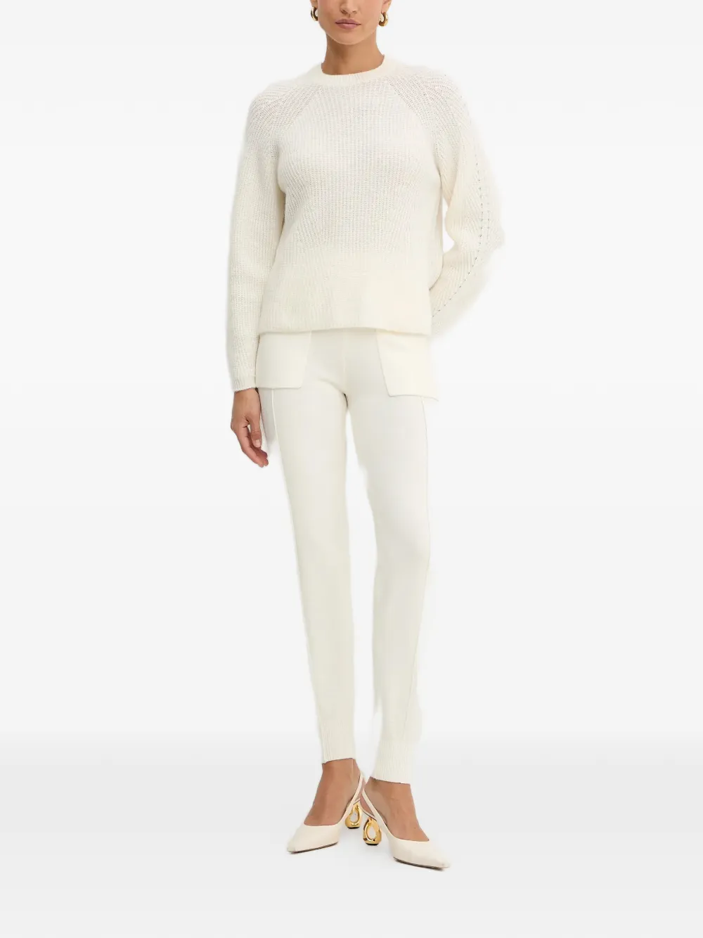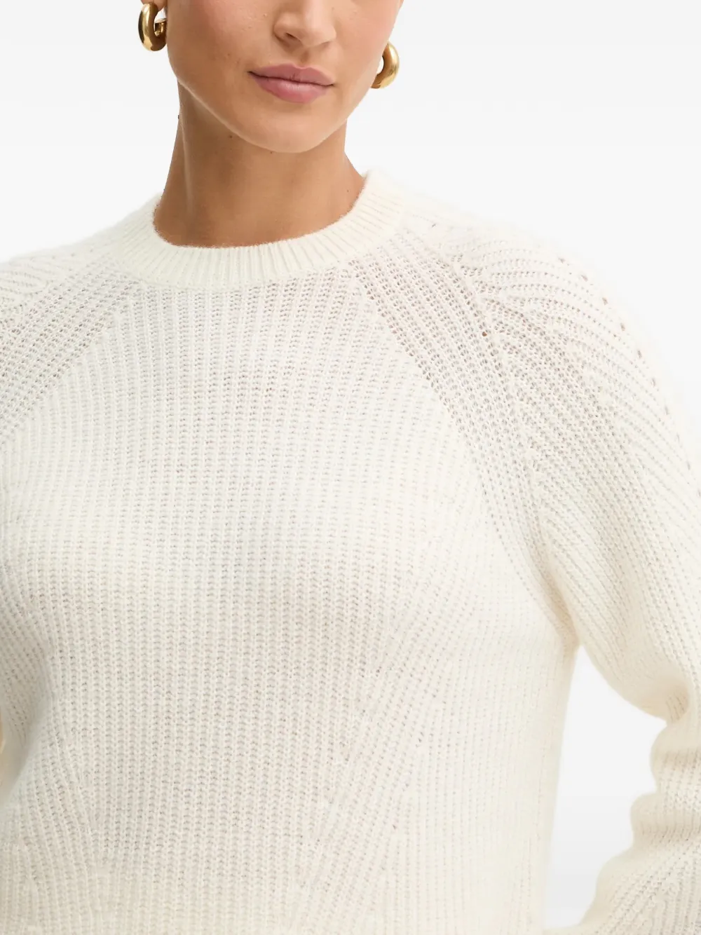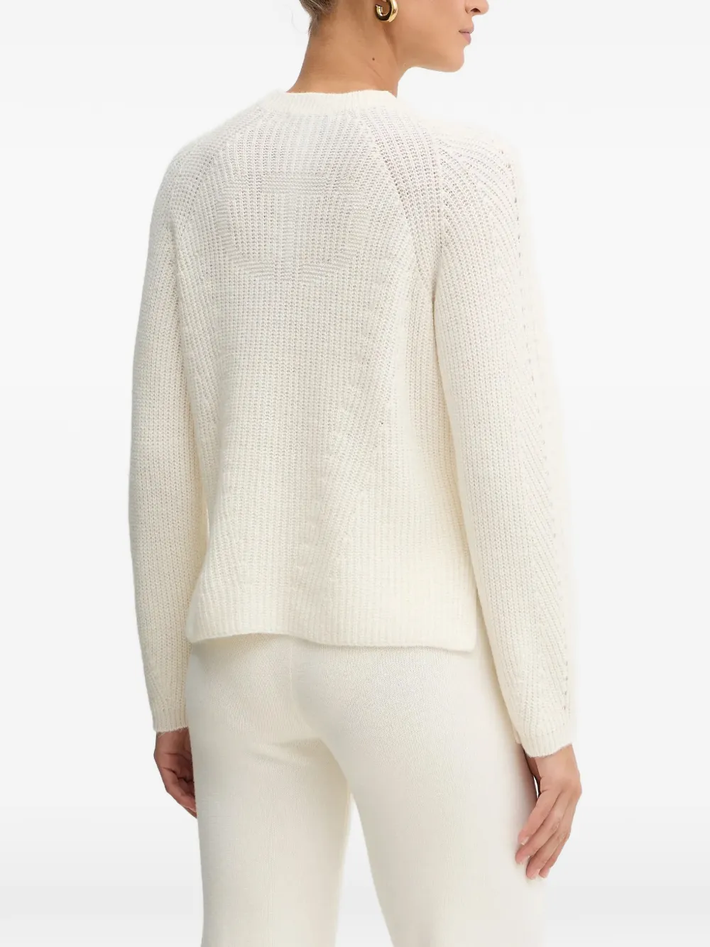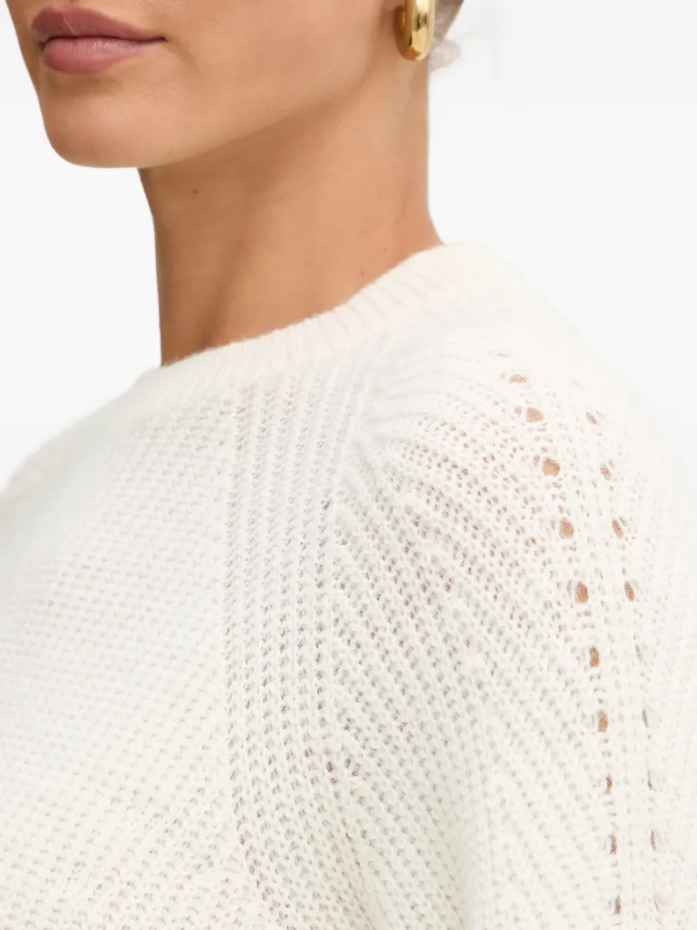 Белый вязаный дизайн, круглый вырез, длинные рукава, текстурированная отделка, ажурные детали
