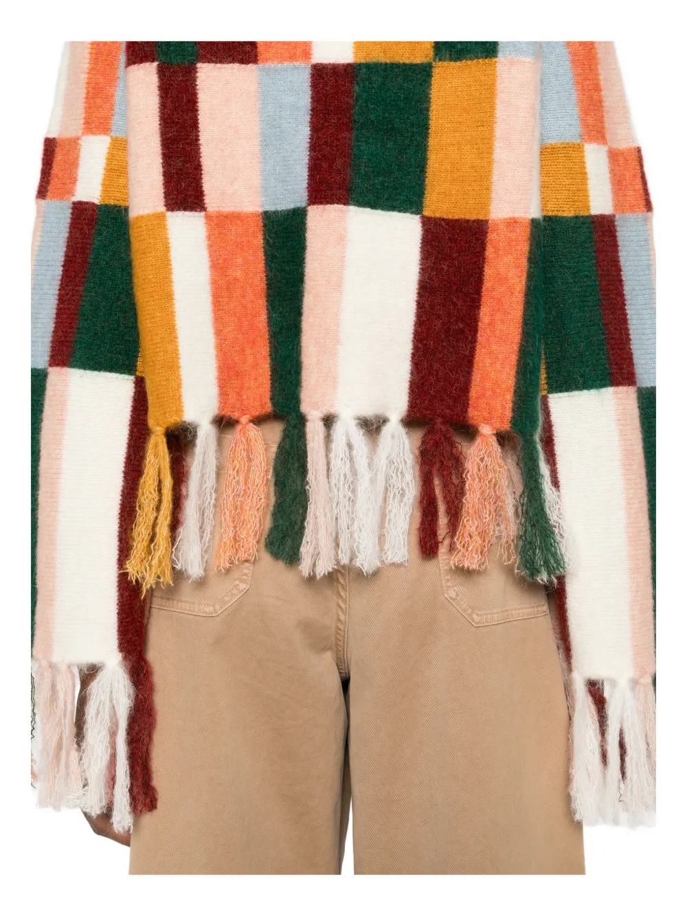 Белый и разноцветный круглый вырез, длинные рукава, отделка бахромой