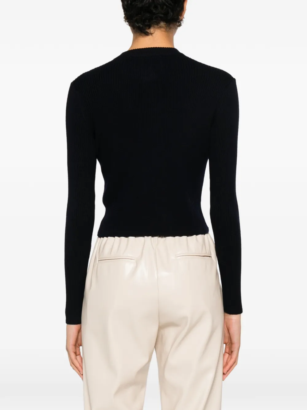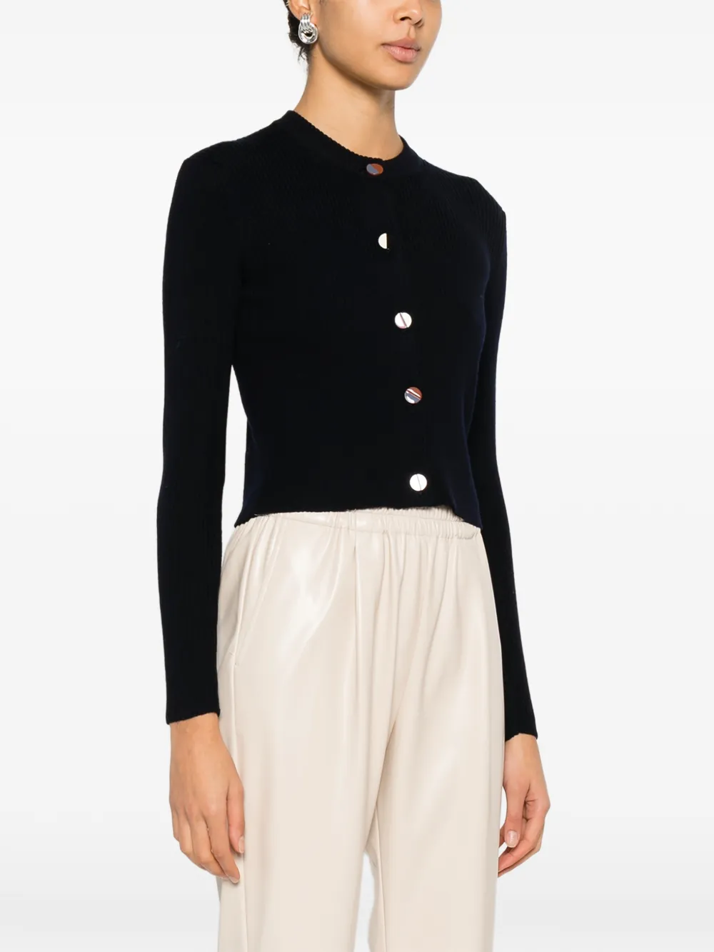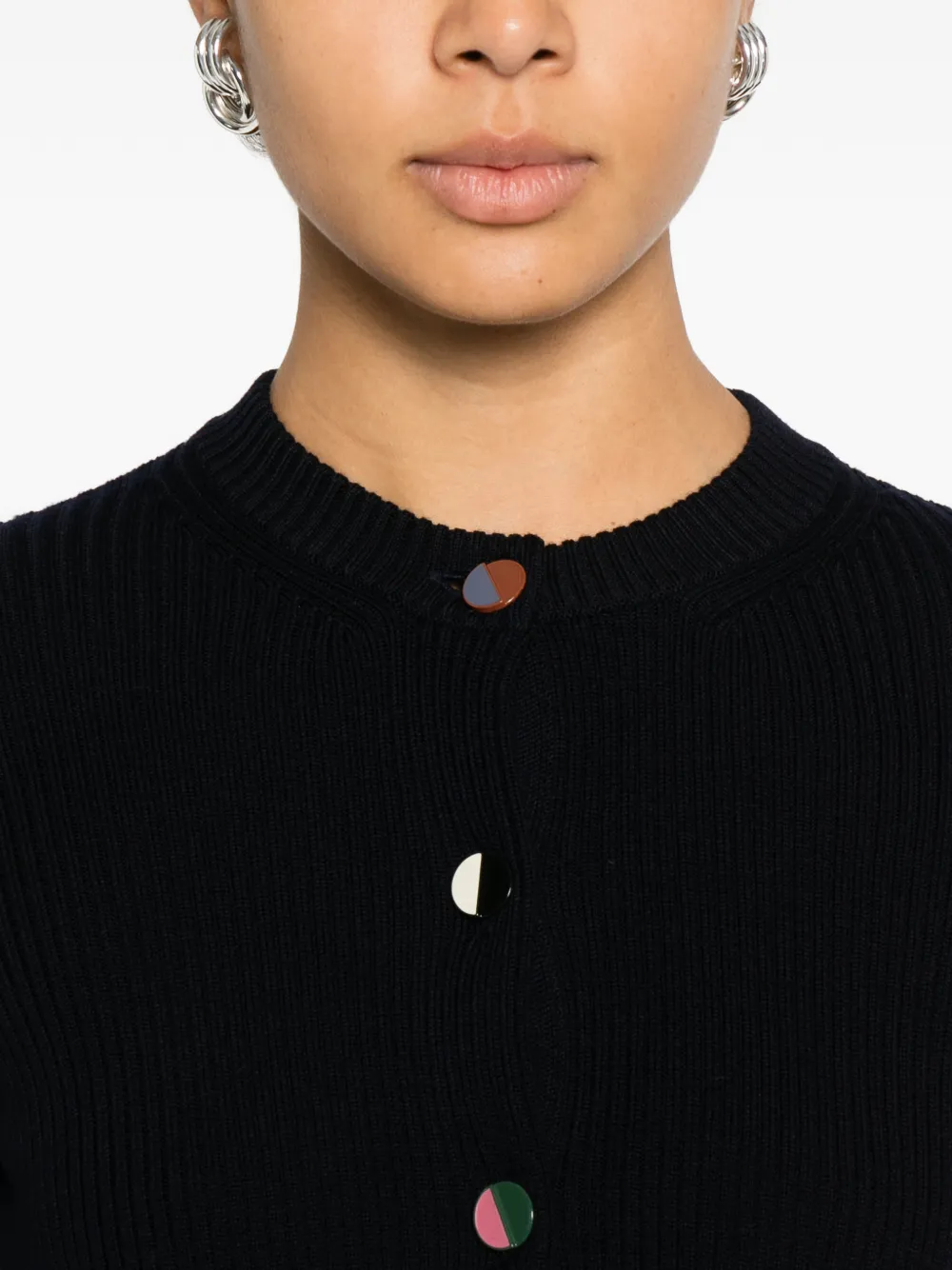 Темно-синий круглый вырез, застежка на пуговицы спереди, длинные рукава, ребристая вязка