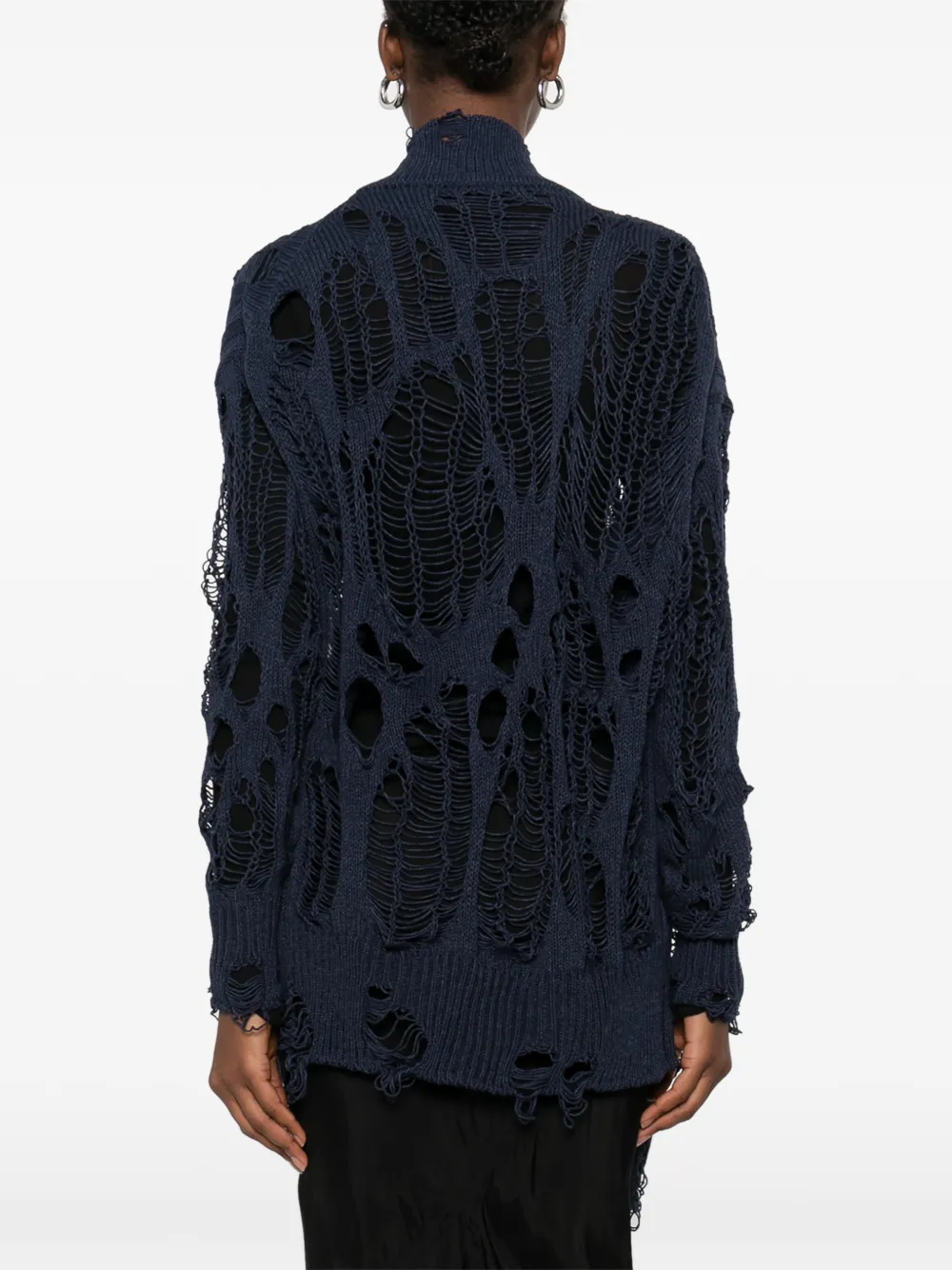 Синий свитер с эффектом состаренности, высоким воротом, вязаной конструкцией и открытой вязкой