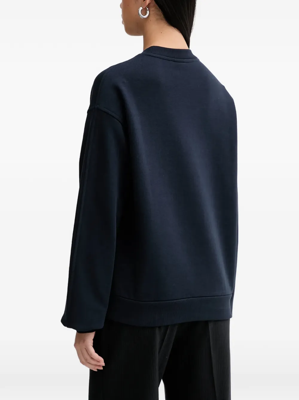 Темно-синий цвет, круглый вырез, длинные рукава, нашивка с логотипом, трикотажные манжеты, трикотажный низ