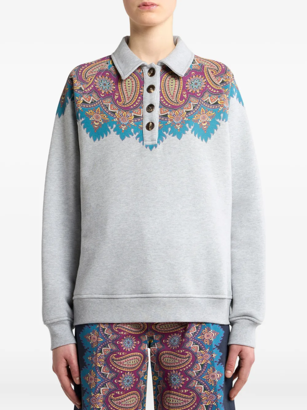 Серый пуловер с принтом "пейсли", воротником-поло, застежкой на пуговицы и длинными рукавами