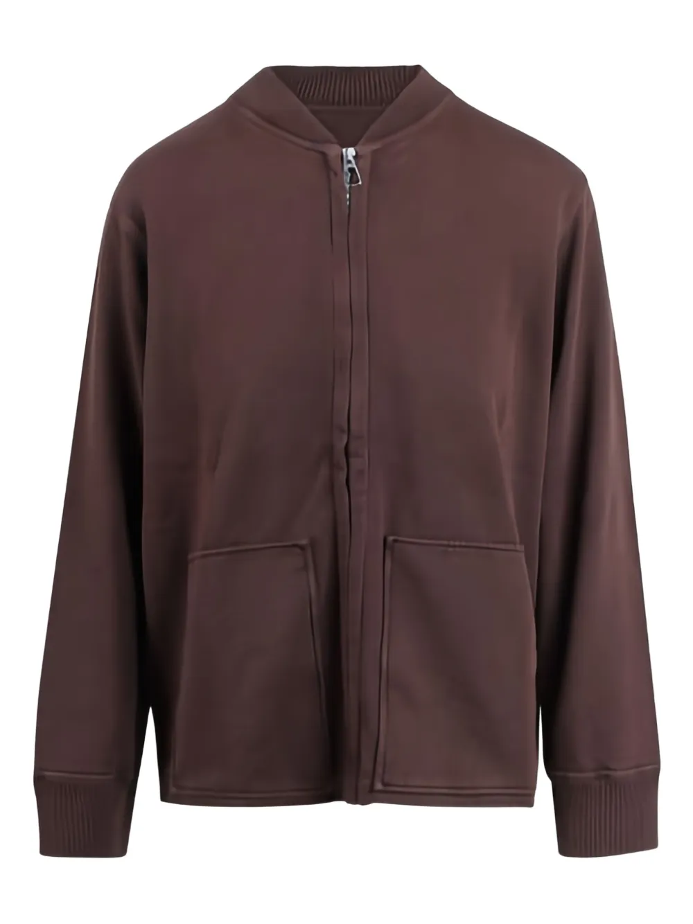 Коричневый цвет, застежка-молния спереди, два накладных кармана спереди, ребристый подол, ребристые манжеты, круглый вырез